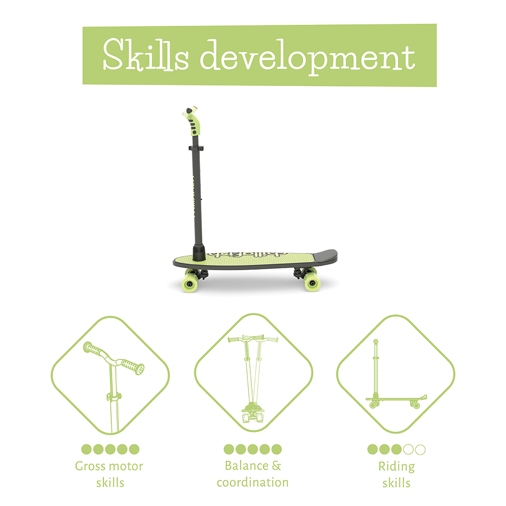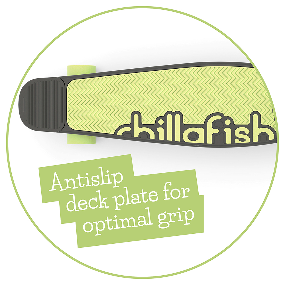 Čilafiš Skejti Skuti je skejtbord sa četiri točka koji se može prilagoditi, a istovremeno je i trotinet sa nagibom za upravljanje. Izduženo međuosovinsko rastojanje sa četiri točka i odvojiva upravljačka ručka su razvijene za laku kontrolu i stabilnost, što ga čini savršenim za mlađu decu da bezbedno uče ravnotežu i klizanje. Za decu bez iskustva u klizanju, mogu se držati za upravljačku ručku kako bi u početku savladali ravnotežu, a kasnije je skinuti i imati prvi skejtbord. Dakle, kada su spremni, samo ih okrenite, otključajte i povucite – nije potreban alat za skidanje upravljačke ručke! Međuosovinsko rastojanje Skejti Skutija je duže nego obično – u poređenju sa daskom. Ovo čini dasku manje sklonom prevrtanju napred ili nazad, pa je samim tim stabilnija i olakšava učenje. Upravljačka ručka se može podesiti brzim otpuštanjem na različite visine kako bi odgovarala visini deteta (64-80 cm). Skejti Skuti ima svestrani rukohvat za jednu ili dve ruke kako bi se prilagodio vašem stilu vožnje – jednostavan i bezbedan ili hladan i brz.