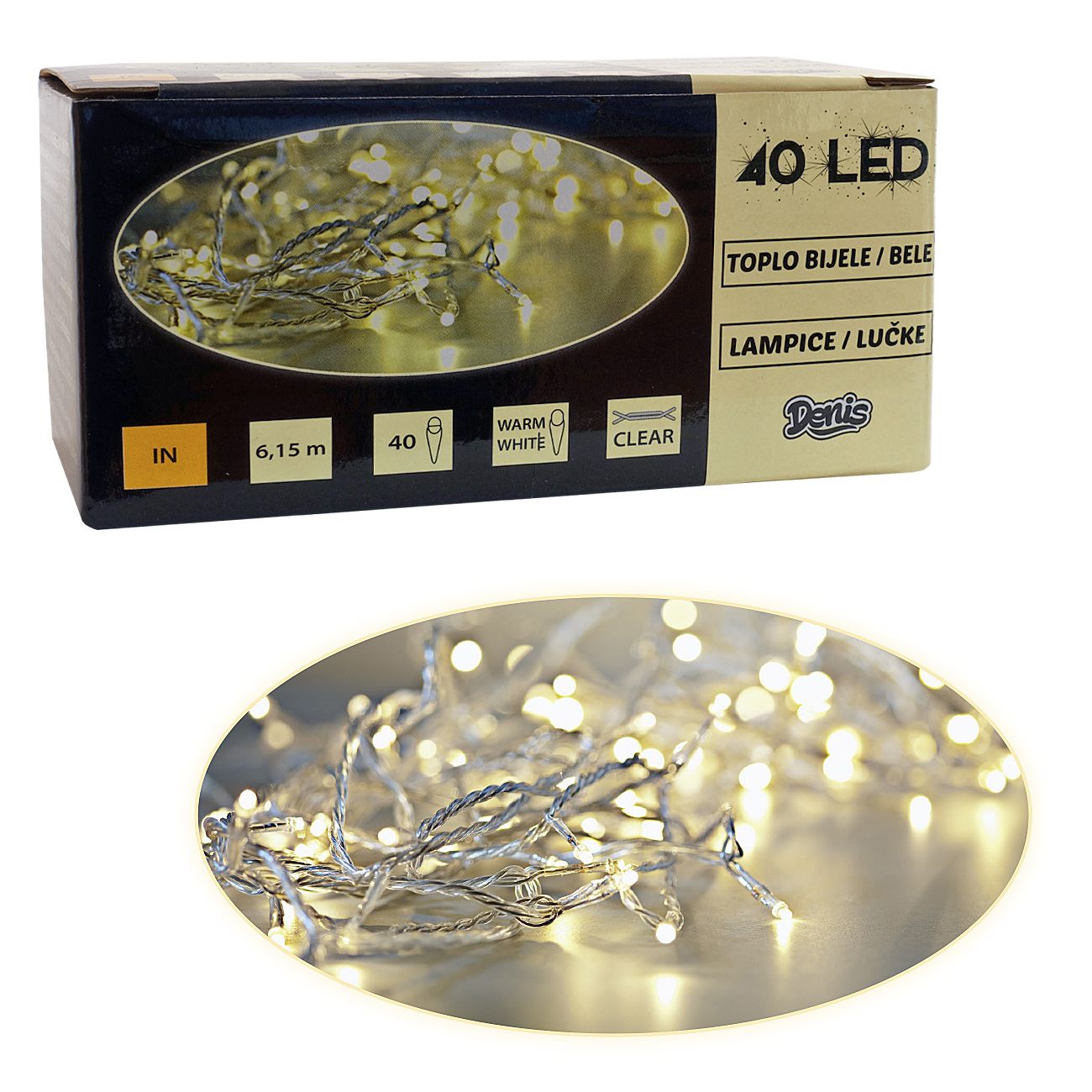 Da li ste se ikada našli u situaciji da želite da ukrasite prostor kao što je prozor ili vrata za Božić, ali nemate utičnicu u blizini? Za ovakve i slične slučajeve, ovaj lanac od 40 LED lampi na baterije je idealno rešenje. Nije potrebna utičnica ili produžetak! Pored toga, izgleda veoma elegantno u akrilnoj providnoj optici, a toplo belo osvetljenje će vašem domu dati toplu božićnu atmosferu. Karakteristike: Ukrasni lanac sa LED lampama na baterije, 40 komada u nizu na rastojanju od 15 cm, na providnoj žici. Boja svetla: toplo belo statičko svetlo. Dužina niza sijalica: 5,85 m Dužina kabla od odeljka za baterije do prvog svetla: 0,3 m Ukupna dužina kabla: 6,15 m Radi na baterije, 3xAA – nije uključeno. Tehničke karakteristike: Klasa III / 40 led sijalica k 1,8-3,2V/10mA, 0,018-0,032V. Samo za untrašnju upotrebu.