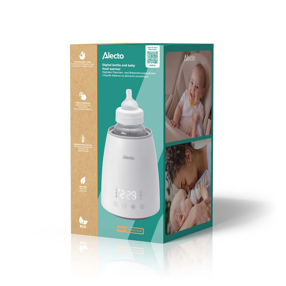 Alecto Baby BW900 je višenamenski grejač flašica i dečje hrane snage 500 W, koji brzo zagreva, odmrzava i steriliše. Zahvaljujući preglednom ekranu i unapred podešenim režimima, grejač je vrlo lak i efikasan za upotrebu.