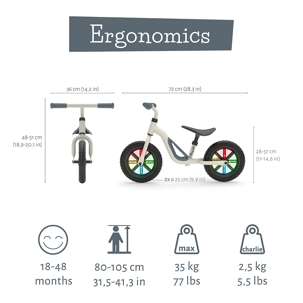 Charlie dolazi u više modernih boja i sjajnom dizajnu koji se dopada mališanima, a zahvaljujući prilagodljivim komponentama može se koristiti tokom dužeg perioda dok dete raste. Preporučeno za decu uzrasta 18 – 48 meseci i visine oko 80 – 105 cm.