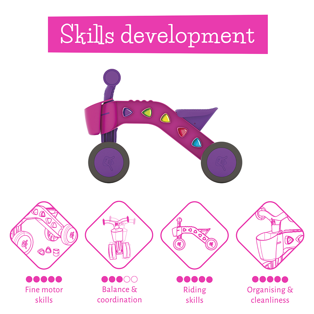 Chillafish ItsiBitsi Blocks je moderno dizajnirana guralica sa 4 točka koja služi kao prvi trener ravnoteže, namenjena mališanima uzrasta od 1 do 3 godine. Ovaj model podstiče razvoj grube motorike (ravnoteža, koordinacija, kretanje), ali i fine motorike kroz igru sa blokovima. Na prednjem delu nalazi se slatka korpica sa šarenim, providnim blokovima za igru. Blokovi se ubacuju u otvore na ramu, a zahvaljujući asimetričnom obliku, dete mora da pronađe pravi položaj kako bi ih pravilno umetnulo – što predstavlja odličan prvi korak u razvoju preciznosti i koordinacije pokreta. Providni i jarkih boja, blokovi čine da ItsiBitsi izgleda posebno atraktivno i jedinstveno, a dete može da personalizuje svoju guralicu kombinovanjem boja u ramu. Pored upečatljivog dizajna, model je izuzetno izdržljiv zahvaljujući čeličnim osovinama točkova i snažnoj konstrukciji od kvalitetne plastike. Ugrađeni limiter ugla skretanja sprečava prekomerno okretanje upravljača i smanjuje rizik od prevrtanja. Stabilna, ali dovoljno izazovna da podstakne razvoj prve ravnoteže, ItsiBitsi je lagana za manevrisanje i jednostavna za nošenje, što je čini praktičnom i za roditelje. Čvrsti plastični točkovi omogućavaju korišćenje i u zatvorenom i na otvorenom prostoru. Dolazi potpuno sastavljena i spremna za prvu vožnju odmah po otvaranju pakovanja. Preporučena visina deteta: 70–100 cm Visina sedišta: 23 cm Uzrast: 1–3 godine ItsiBitsi – preslatka, stilizovana i izdržljiva guralica koja pruža odličan odnos cene i kvaliteta i omogućava mališanima da se igraju još duže!