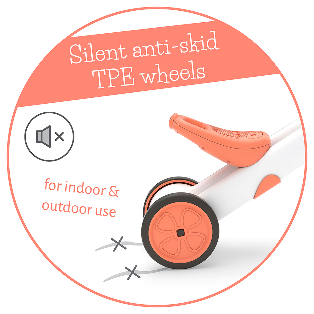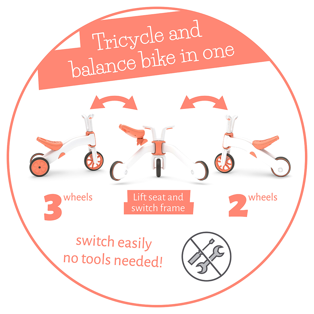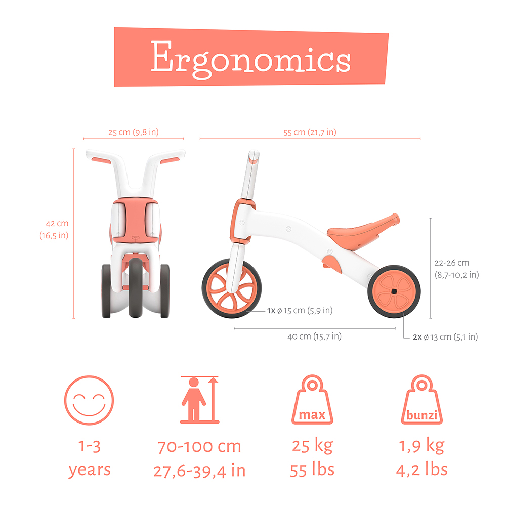 Chillafish Bunzi je jedinstveno dizajniran 2-u-1 balans bicikl i tricikl, napravljen da na zabavan i siguran način pomogne vašem detetu da nauči ravnotežu sopstvenim tempom. Vaše dete prvo uči da održava balans na tri točka, a kada bude spremno, prelazi na vožnju sa dva točka, što je odlična priprema za kasnije biciklističke veštine. Bunzi je izrađen od kvalitetnog ABS materijala, a okvir se u samo nekoliko sekundi može prebaciti iz tricikla u balans bicikl – bez ikakvih alata. Zadnja dva točka u tricikl modu pružaju stabilnost, ali su postavljena bliže jedno drugom, tako da dete oseti kontrolu nad sopstvenim balansom i samopouzdanje pri vožnji. Prilagodljivo sedište raste zajedno sa detetom: 22 cm u tricikl modu i 26 cm u balans modu. Tihe, antisklizne i neostavljajuće tragove gume omogućavaju vožnju i u zatvorenom, dok su dovoljno izdržljive za igru napolju. Bunzi je lagan (1,8 kg), što olakšava nošenje zahvaljujući praktičnoj ručki na sedištu. Skrivena korpica omogućava da dete ponese omiljenu igračku ili užinu, a pritom trenira finu motoriku dok upravlja svojim vozilom. Sa rukohvatima u obliku zečića, intuitivnim dizajnom koji raste sa detetom i živopisnim bojama koje ističu ličnost vašeg mališana, Bunzi će postati omiljeni pratilac u igrama. Preporučeno za decu od 1 do 3 godine, maksimalna nosivost: 25 kg. Bunzi se već 7 godina prodaje širom sveta, a mnogi roditelji ga koriste za više mališana u porodici. Dolazi potpuno sastavljen i spreman za vožnju, a sedište se podešava bez ikakvih alata.