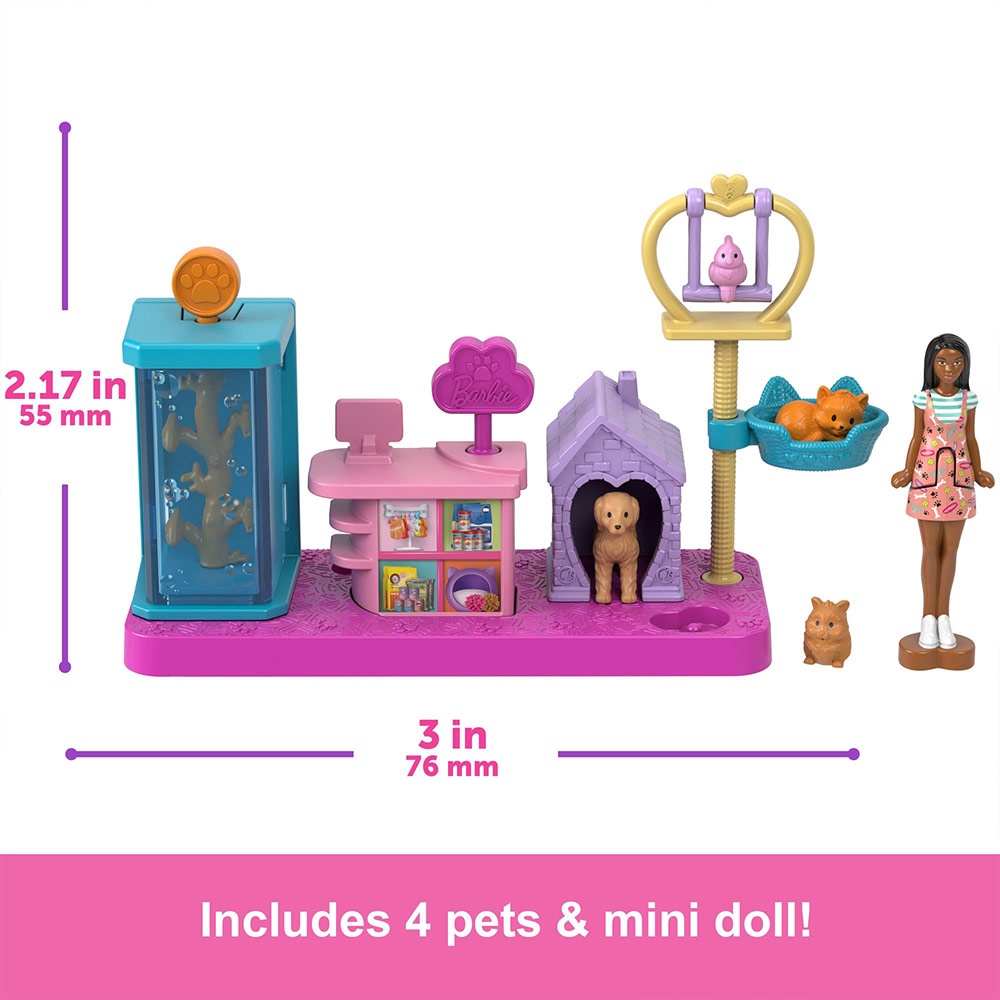Set za igru Barbie Pet salon je spreman za igru ili izlaganje i dolazi sa mini lutkom od 3,8 cm! Set za igru sadrži zabavne, interaktivne elemente za igru kao što su kasa, izlog proizvoda za kućne ljubimce, akvarijum, kućica za kućne ljubimce i korpa za mačke. Deca mogu iznovada se kreiraju scene sa Baribe lutkom od 3,8 cm u različitim prostorima za igru, uključujući kavez za ptice i rotirajući akvarijum!