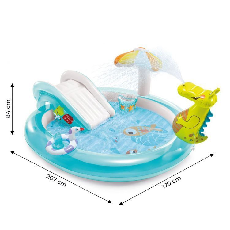 MULTIFUNKCIONALNI BAZEN NA NADUVAVANJE Bazen ukupnih dimenzija: 295x191x130cm je napravljen od izdržljivog PVC-a. Celo igralište je veoma šareno, izgleda kao fabrika slatkiša. U bazenu će dete naći takve atrakcije kao što su tobogan sa mekim sletanjem, fontana za vodu povezana sa baštenskim crevom, 6 lopti za bacanje. Igralište je podeljeno na dve komore kapaciteta 206l i 168l i prosečne visine vode 14cm. Bazen može da izdrži maksimalno opterećenje do 54 kg. PAKOVANJE: Proizvod je upakovan u šarenu kartonsku kutiju proizvoda, ceo bazen je propisno obezbeđen da se ne ošteti prilikom transporta. Veličina pakovanja: 48×40,5×15 cm, Težina: 7,4 kg