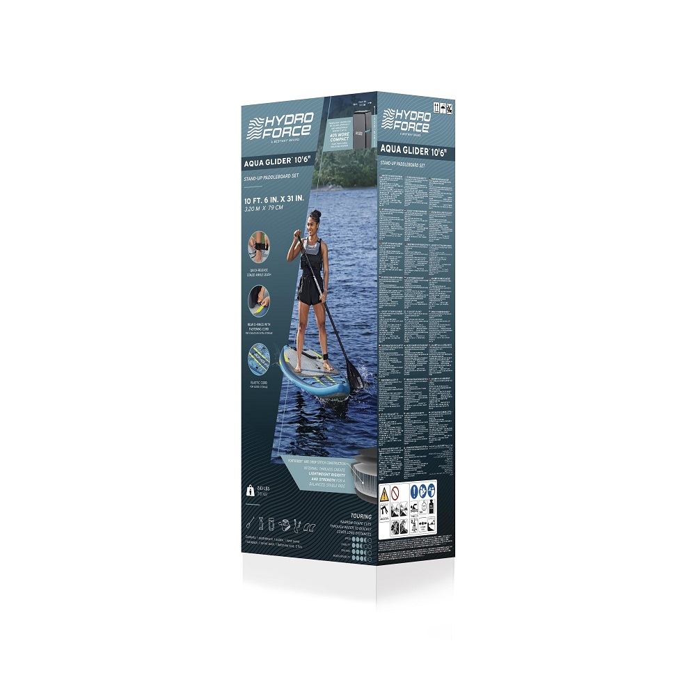 Hydro Force Aqua Glider 10’6 SUP daska na naduvavanje je touring model dizajniran za stabilno i efikasno veslanje na dužim relacijama. Zahvaljujući užem obliku koji lakše seče vodu, ova SUP daska omogućava brže kretanje i lakše održavanje pravca, što je čini idealnom za rekreativno veslanje na jezerima, rekama i mirnijem moru.