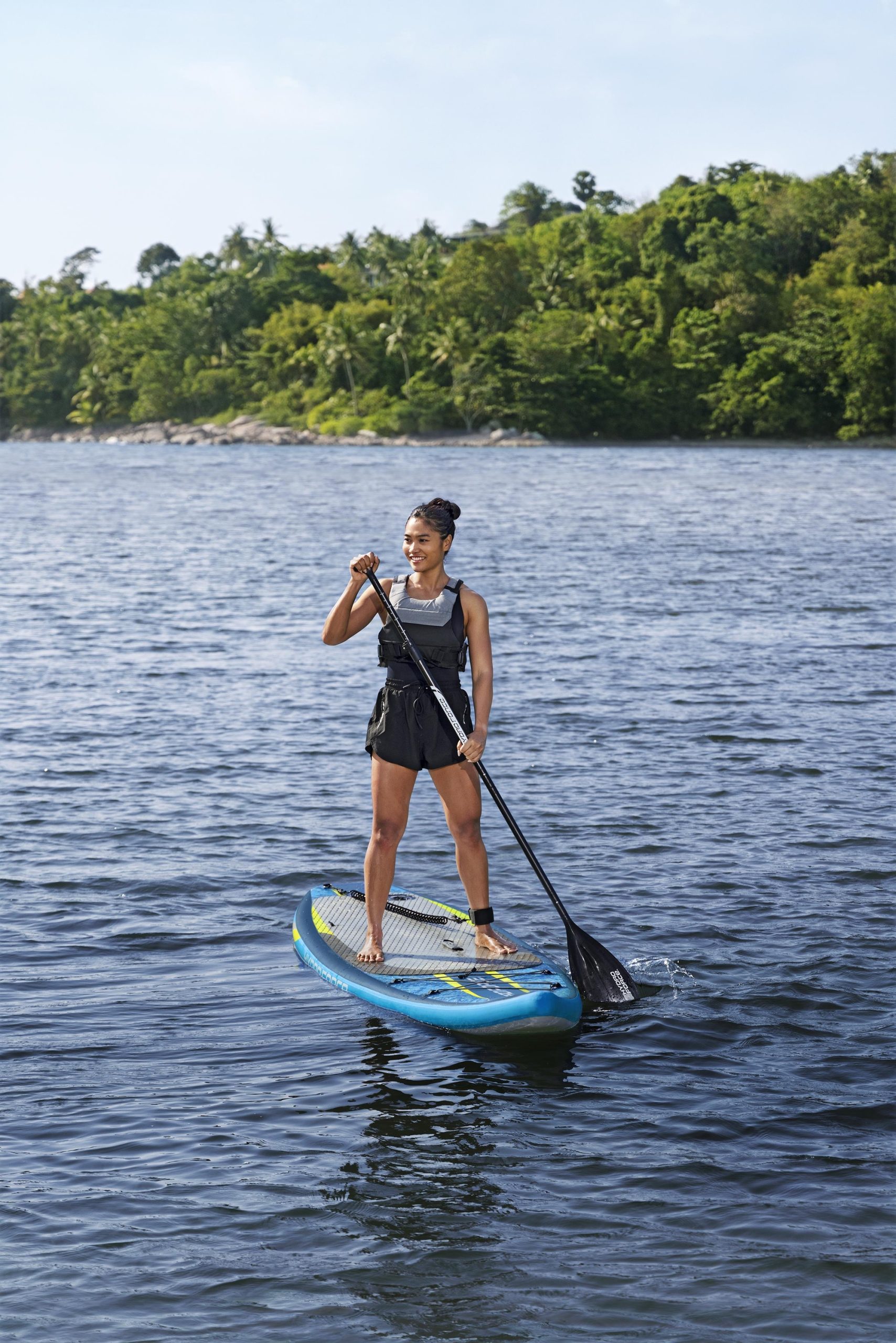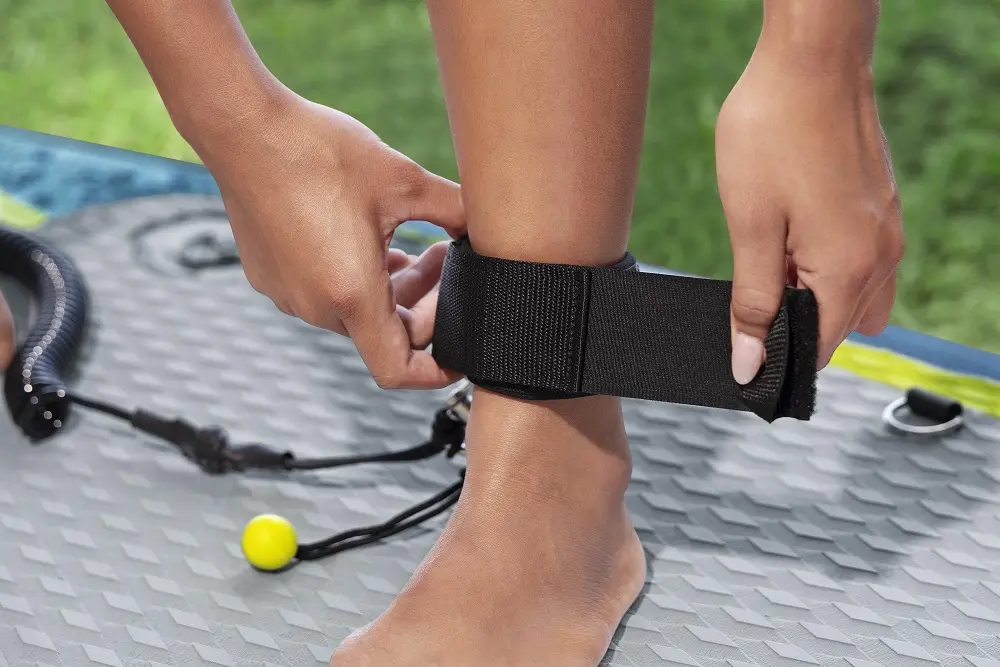 Neklizajuća diamond traction podloga omogućava siguran oslonac tokom veslanja, dok dve uklonjive peraje poboljšavaju pravolinijsko kretanje i stabilnost na vodi. Spiralna sigurnosna vrpca za gležanj (leash) drži dasku povezanu sa korisnikom i može se brzo otpustiti u slučaju potrebe.