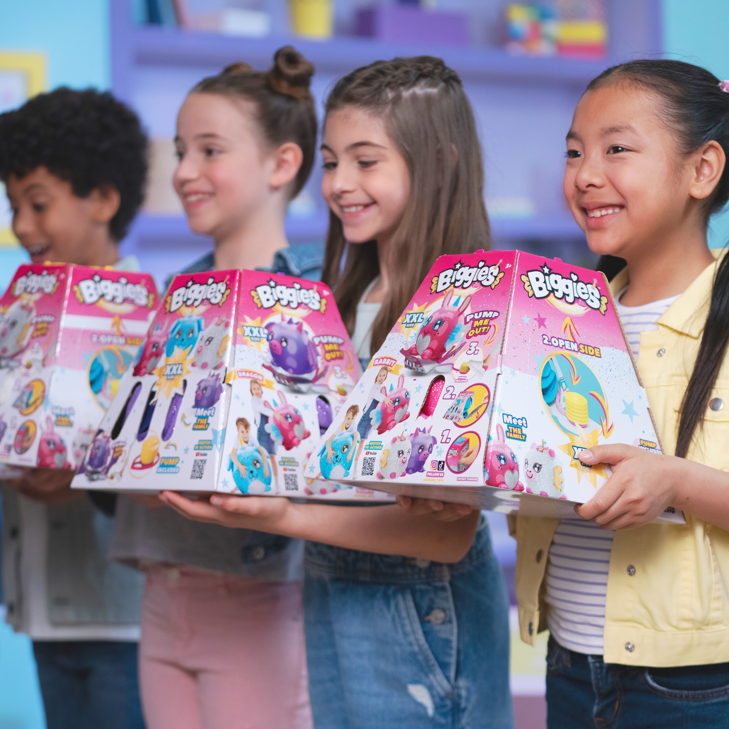 Biggies plišane igračke dolaze u misterioznoj kutiji, sa koje je potrebno odlepiti nalepnicu kako bi se otkrila pumpa, a zatim pumpati dok plišana igračka ne počne da raste. Tokom pumpanja, plišana igračka postaje sve veća i veća dok kutija ne pukne i lik se otkrije uz cool POP efekat!
