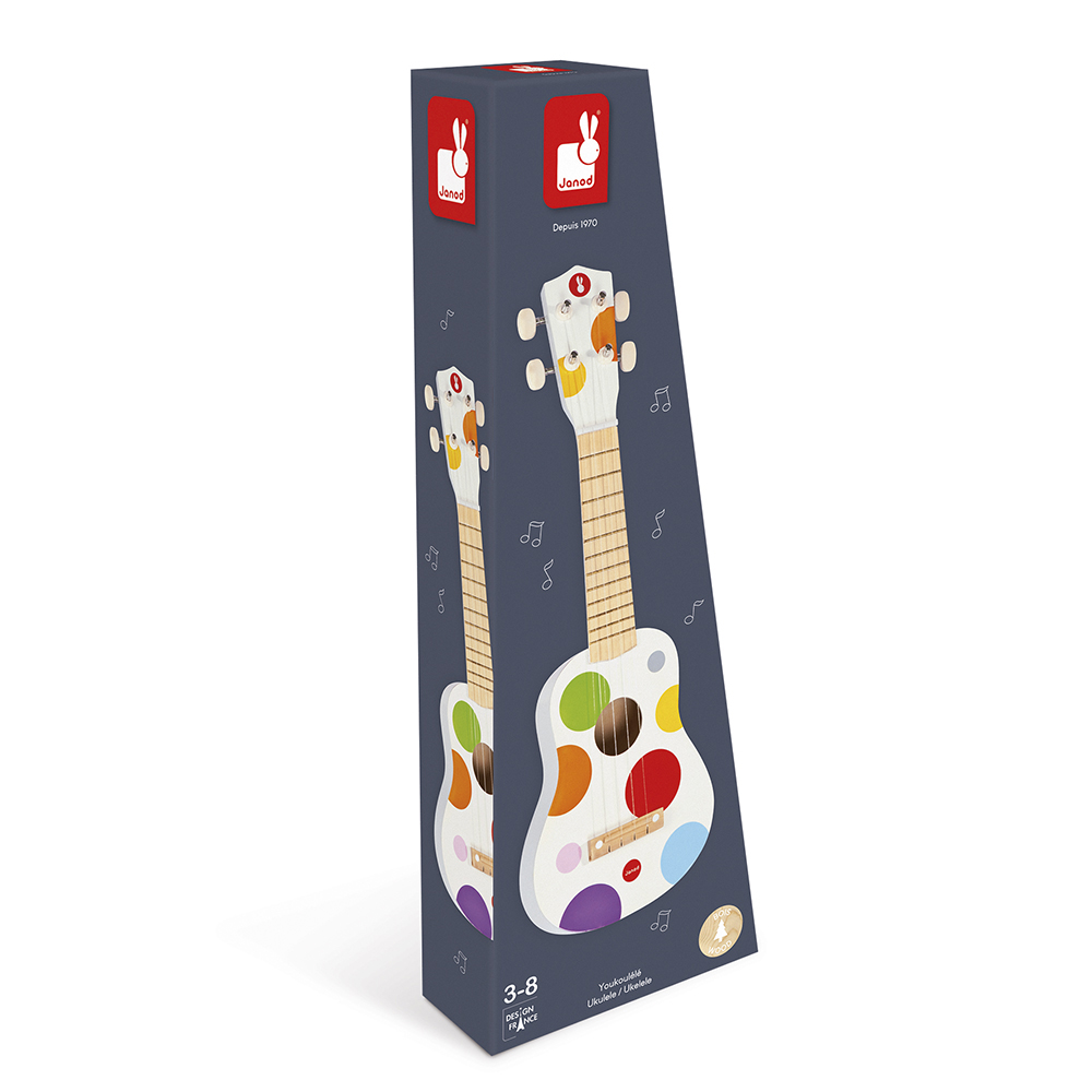 Neka muzika svira! Ovaj drveni ukulele za decu uzrasta od 3 godine i više oduševiće muzičare u njihovom stvaranju. Ovaj ukulele se može pohvaliti sa 4 najlonske žice, šarenim dizajnom i deo je našeg Konfeti asortimana: linije igračaka koje imitiraju muzičke instrumente sa motivima Pop en roka! Kakva će radost biti za vaše dete da ima svoj „odrasli“ instrument i da priredi predstavu; to će mu omogućiti da izgradi samopouzdanje, pored toga što će menjati svoja senzorna iskustva. Zvezda se sprema!