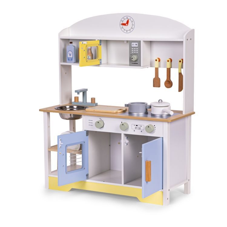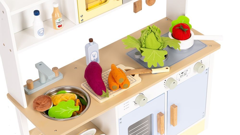 Igračka kuhinja ECOTOYS je kompletan set za kreativnu igru, namenjen deci starijoj od 3 godine. Izrađena je od izdržljive MDF ploče i ima stabilnu konstrukciju koja obezbeđuje bezbednu upotrebu. Kuhinja je opremljena funkcionalnim elementima kao što su rerna, mikrotalasna, sudopera, mašina za pranje veša i dva ringlija sa dugmićima koji proizvode klik zvukove. Sva vrata i ormarići se mogu otvarati, što omogućava praktično odlaganje dodataka. Sat sa pokretnim kazaljkama pomaže deci da nauče planiranje i orijentaciju u vremenu, dok radna ploča i sudopera podržavaju razvoj mašte i finih motoričkih veština. Set uključuje 12 drvenih dodataka: 2 tanjira, nož, kašiku, lopaticu, šerpu sa poklopcem, tiganj, dasku za sečenje i lažne boce za maslinovo ulje, mleko i kečap. Ceo set je pažljivo obrađen, što čini kuhinju odličnim dodatkom kako u dečijoj sobi, tako i u igraonici. PAKOVANJE – Proizvod je upakovan u specijalno ojačanu transportnu kutiju, a svi delovi su pažljivo obezbeđeni kako bi se sprečila oštećenja tokom transporta. Dimenzije pakovanja: 73×50,5×11,5 cm Težina: 9,4 kg
