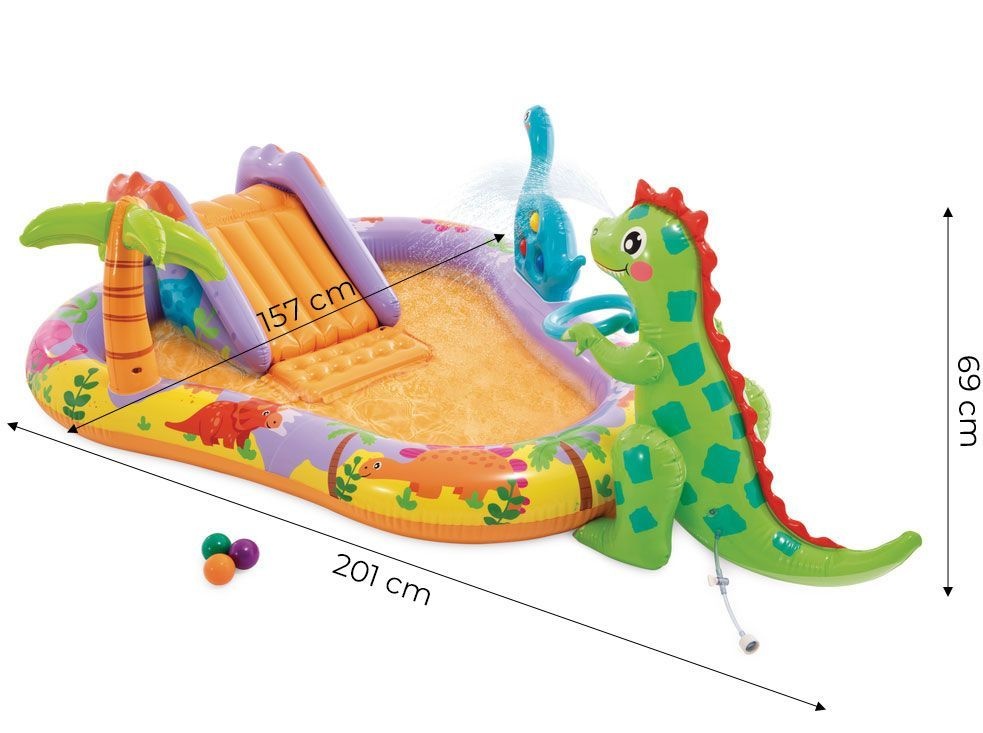 Dečiji bazen na naduvavanje sa vodenim parkom, toboganom, fontanom i dinosaurima INTEX 56139 Pretvorite svoje dvorište u pravo mini-vodeno carstvo uz Intex Dino Park! Ovaj zabavni vodeni park pruža brojne aktivnosti koje će oduševiti vaše mališane tokom letnjih dana. Karakteristike: Dimenzije: 201 x 157 x 69 cm Zapremina vode: 159 litara (pri punjenju do 80% kapaciteta) Maksimalno opterećenje: 54 kg Preporučeni uzrast: 2+ godine (uz nadzor odraslih) Sadržaj pakovanja: Igraonica u obliku dinosaura: Pruža sate zabave i osveženja. Tobogan: Sa mekanim dnom za sigurno klizanje u mini-bazen. Fontana: Prskalica koja se lako povezuje na baštensko crevo, pružajući dodatnu zabavu. Dodatni pribor: Set uključuje šest šarenih loptica i prstenova za gađanje, kao i dva naduvana dinosaura za još više igre. Dodatne informacije: Lako postavljanje: Brzo naduvavanje za nekoliko minuta. Jednostavno pražnjenje: Ventil za brzo pražnjenje vode. Bezbednost: Svi elementi su napravljeni od bezbednih materijala, a deca treba da se igraju pod nadzorom odraslih. Intex Dino Park je idealan za stvaranje nezaboravnih trenutaka i igru na otvorenom sa porodicom i prijateljima.