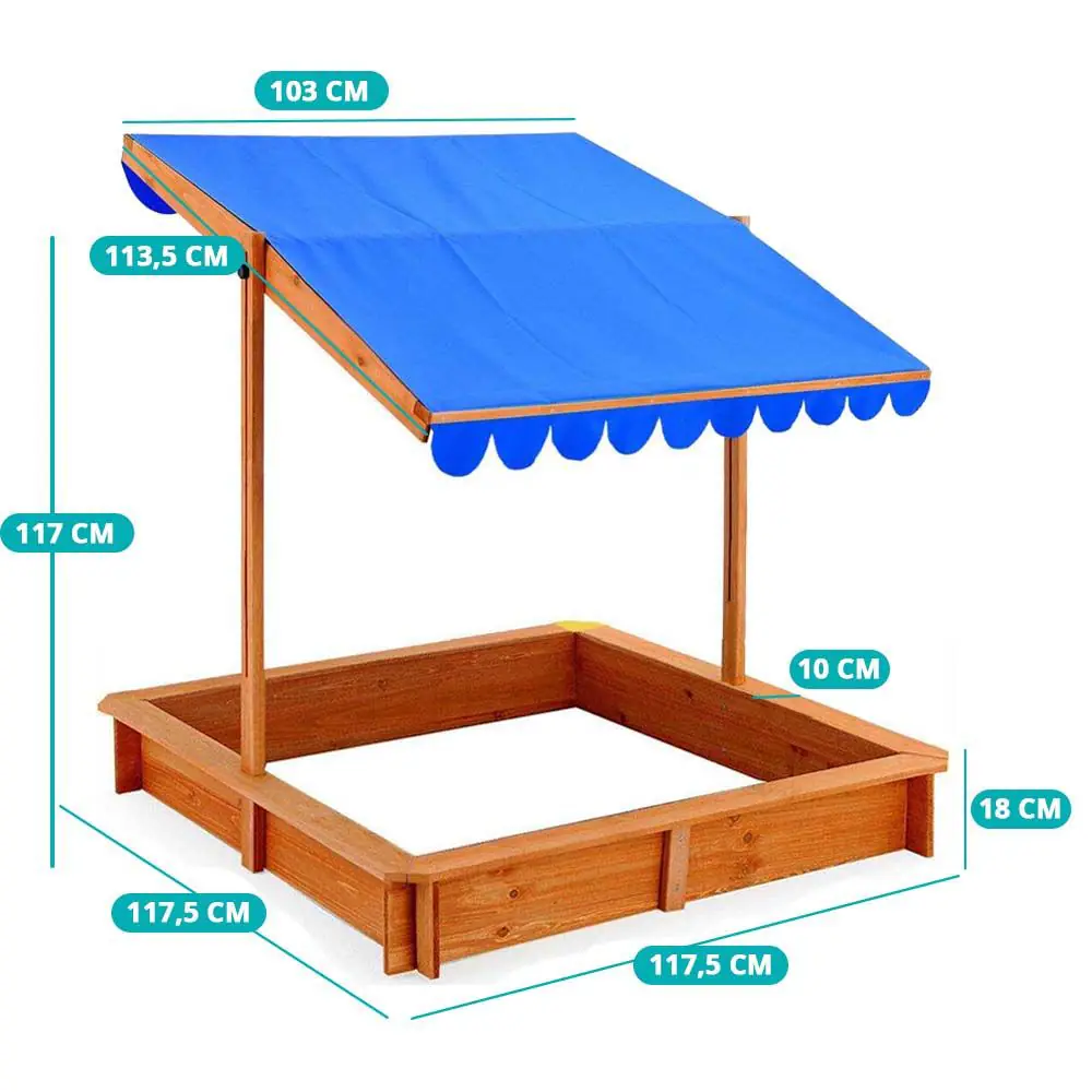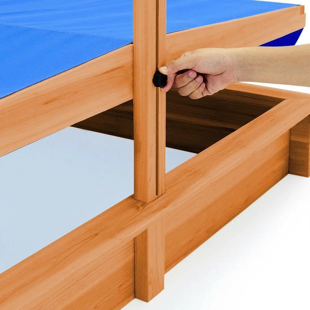 Pošto se lako sklapa, deca mogu brzo da ga zauzmu. Visina krova je podesiva (do 110 cm). Drvene daske za sedenje prolaze duž 4 strane peskarnika, tako da se i roditelji mogu udobno smestiti dok se igraju (nosivost 80 kg).