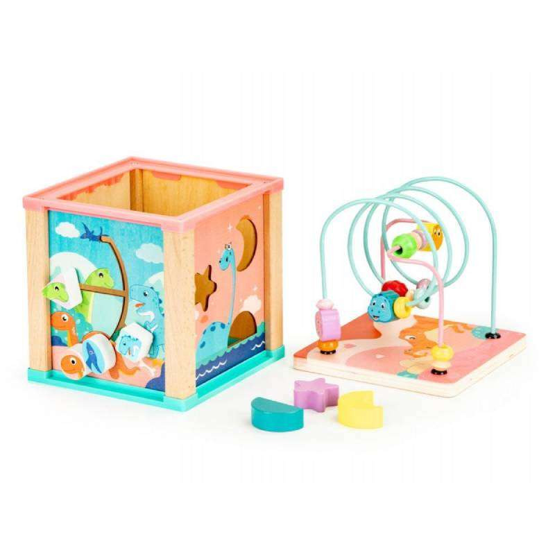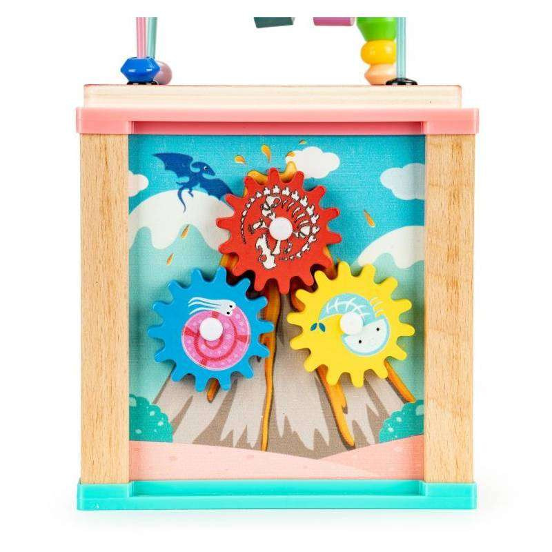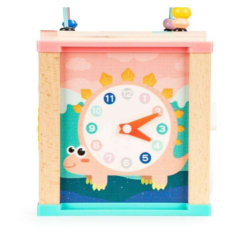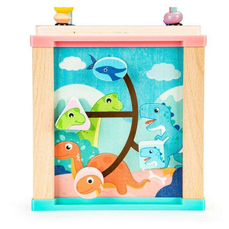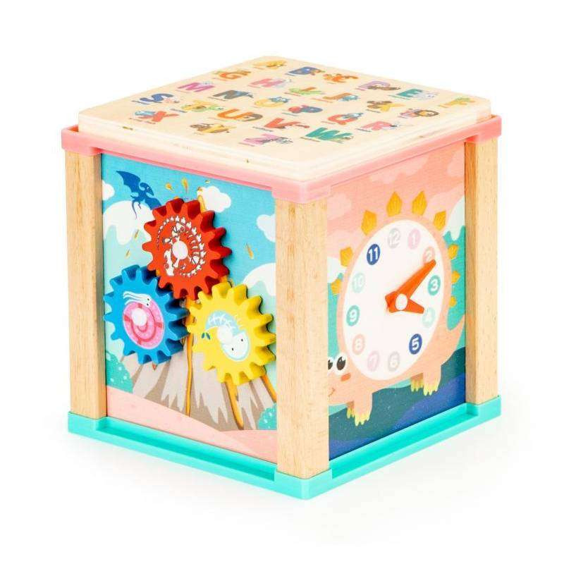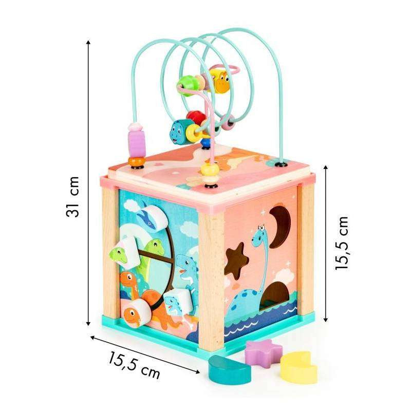 Kocka je napravljena od drveta i nudi razne edukativne aktivnosti. Ova igračka razvija detetove manuelne veštine i koordinaciju oko-ruka, istovremeno stimulišući prepoznavanje oblika i boja. Igračka sadrži: lavirint, tablu sa satom, sorter blokova sa tri drvena bloka, pokretne zupčanike i tablu za učenje engleskog jezika. Svaka strana kocke ima drugačiju funkcionalnost, što čini igračku izuzetno atraktivnom za mališana i sprečava dosadu. PAKOVANJE Igračka je upakovana u šarenu kutiju proizvoda, svi elementi igračke su propisno pričvršćeni da se ne oštete prilikom transporta. Uzrast: 3+ Dimenzije pakovanja: 17x17x16 cm, Težina: 0,9 kg