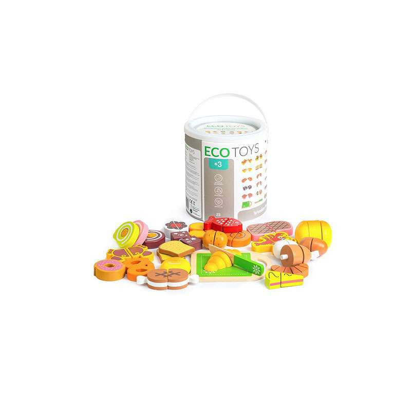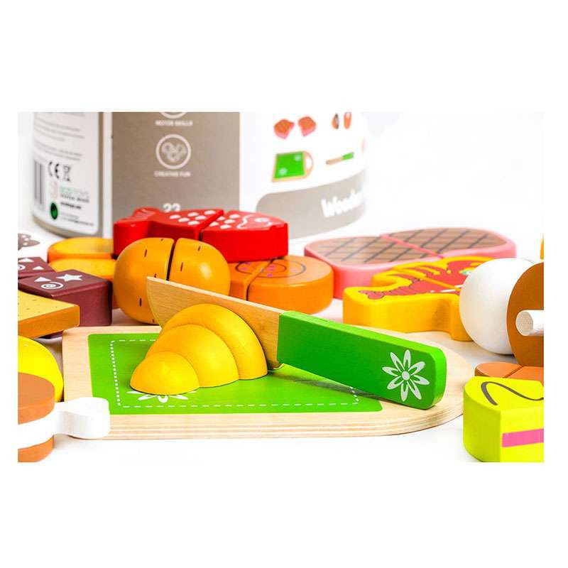 Svi prehrambeni proizvodi iz kompleta izrađeni su od drveta sa zaobljenim ivicama i farbani ekološkom bojom. Komplet sadrži 21 prehrambeni proizvod koji se može rezati nožem i daskom za sečenje uključeni u set. Svaka hrana se sastoji od najmanje dva dela povezana čičak trakom. Igračka savršeno dopunjuje igru sa drvenom kuhinjom. Sve je upakovano u elegantnu kutiju. PAKOVANJE Proizvod je upakovan u posebno ojačanu kutiju za transport, svi elementi seta su propisno pričvršćeni kako bi se sprečilo oštećenje tokom transporta. Uzrast: 3+ Dimenzije pakovanja: 18x18x19 cm, Težina: 1 kg