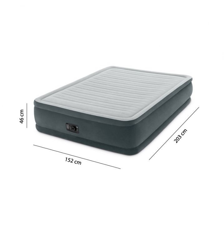Uživajte u vrhunskom komforu i praktičnosti sa dušekom na naduvavanje INTEX, dimenzija 203×152 cm, koji dolazi sa integrisanom električnom pumpom. Ovaj dušek je savršen za upotrebu kod kuće, na putovanjima ili kampovanju, pružajući vam udobnost sličnu klasičnom krevetu. Karakteristike proizvoda: – Velike dimenzije: Površina od 203×152 cm pruža dovoljno prostora za dve osobe, omogućavajući opušten i udoban san. – Integrisana električna pumpa: Zahvaljujući ugrađenoj pumpi, dušek se može brzo napumpati ili ispumpati za samo nekoliko minuta, štedeći vaše vreme i trud. – Kvalitetni materijali: Izrađen od izdržljivog PVC materijala sa baršunastom površinom koja sprečava klizanje posteljine i pruža dodatnu udobnost. – Dura-Beam tehnologija: Zahvaljujući Fiber-Tech vlaknima, dušek pruža optimalnu podršku i stabilnost, čineći ga pogodnim za dugotrajnu upotrebu. – Kompaktno skladištenje: Nakon ispumpavanja, dušek se lako sklapa u kompaktnu veličinu i čuva u priloženoj torbi. Specifikacije proizvoda: Dimenzije: 203 x 152 x 46 cm Maksimalna nosivost: 273 kg Težina: oko 8 kg Uključeni dodaci: torba za skladištenje i uputstvo za upotrebu Prednosti: Idealan za goste ili kao privremeni krevet. Pogodan za upotrebu u zatvorenom prostoru i na kampovanju. Brza priprema zahvaljujući integrisanoj pumpi. Dušek na naduvavanje INTEX 203×152 cm sa pumpom je savršen izbor za sve koji žele praktično, udobno i lako prenosivo rešenje za spavanje. Nabavite ga već danas i uživajte u udobnosti gde god da ste!
