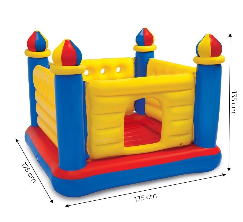 Trambolina na naduvavanje za decu – ECOTOYS Trambolina na naduvavanje za decu brenda ECOTOYS je sjajna zabava za svu decu. Ovaj mini set, inspirisan popularnim skakaonicama, je san svakog deteta. Sa ovakvim zamkom, vaše dete će obožavati igranje na otvorenom. Visoki zidovi i mekano dno osiguravaju bezbednost čak i tokom intenzivne igre. U slučaju oštećenja naduvane površine, set uključuje zakrpu za popravku koja će savršeno sanirati pukotinu. Kada vreme ne dozvoljava igranje u bašti, zamak se može koristiti u zatvorenom prostoru, na primer u dnevnoj sobi. Maksimalno opterećenje zamka je 54 kg. Pakovanje Proizvod je upakovan u šarenu kutiju, svi elementi tramboline su propisno osigurani kako bi se sprečila oštećenja tokom transporta. Dimenzije pakovanja su 55×17.2×41.6 cm, a težina 11.7 kg. Ostale informacije Šifra proizvođača: 48259
