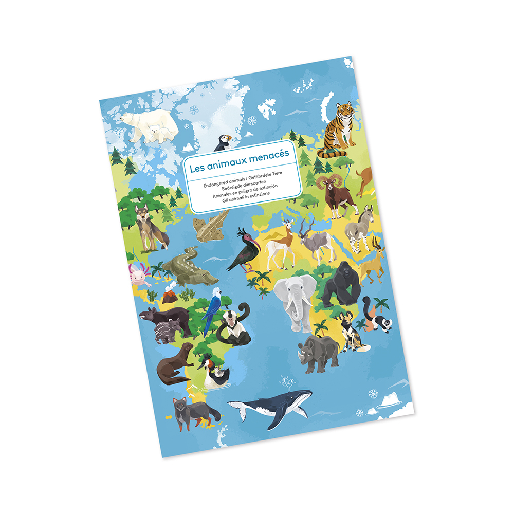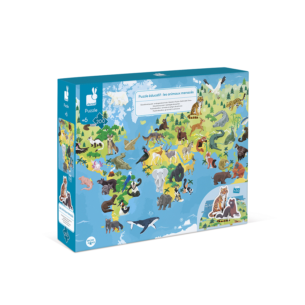 Ova veličanstvena gigantska edukativna kartonska slagalica omogućiće deci da nauče više o ugroženim životinjama. Njihov prvi zadatak biće da kompletiraju slagalicu od 200 delova koja predstavlja našu planetu, zajedno sa ilustracijom dotične vrste, na njihovoj matičnoj teritoriji. Oni će tada moći da dodaju još jednu dimenziju i svom otkriću i slagalici tako što će svaku životinju postaviti na svoje određeno mesto, zahvaljujući 50 kartonskih figurica koje će biti sastavljene uspravno sa postoljem. Uz ovu slagalicu dolazi i edukativna knjižica koja služi kao uvod u ove ugrožene vrste divljih životinja, gde deca mogu da nauče o nekim od razloga zašto im preti izumiranje. Imena životinja navedena su na poleđini svake figurice. Ova ogromna slagalica će pomoći deci da se uhvati ukoštac sa geografijom, a takođe će naučiti o zaštiti divljih životinja. Štaviše, sadrži poster koji služi kao model za početnike. Nakon nekog vremena, oni će moći sami da završe slagalicu!