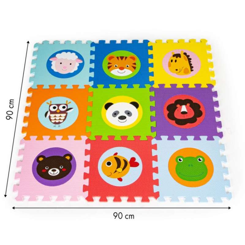 EDUKATIVNA EVA PENA MAT Edukativni podmetač od meke EVA pene savršen je za mališane koji uče da hodaju. Penasta prostirka debljine 0,9 cm napravljena od slagalica će obezbediti izolaciju od zemlje. Set se sastoji od 9 velikih, šarenih kvadratnih slagalica sa slikama životinja. Elementi se takođe mogu koristiti za formiranje meke kocke za igru sa detetom. Centar slagalice sa slikom životinja može se ukloniti. Proizvod je sertifikovan bezbedan za zdravlje deteta. Otirač se lako čisti i uklapa se na bilo koju površinu. Komplet uključuje specijalnu torbu za transport. Širina: 90 cm, dužina: 90 cm. PAKET Proizvod je upakovan u posebno ojačanu kutiju za otpremu, svi mat elementi su propisno pričvršćeni da se ne bi oštetili tokom transporta. Dimenzije pakovanja: 34,5x33x10 cm, Težina: 1 kg“