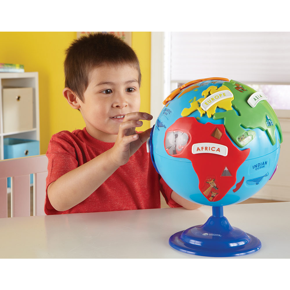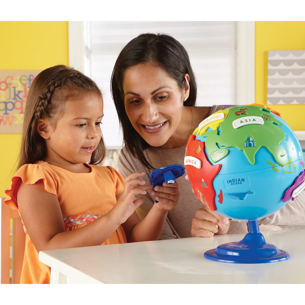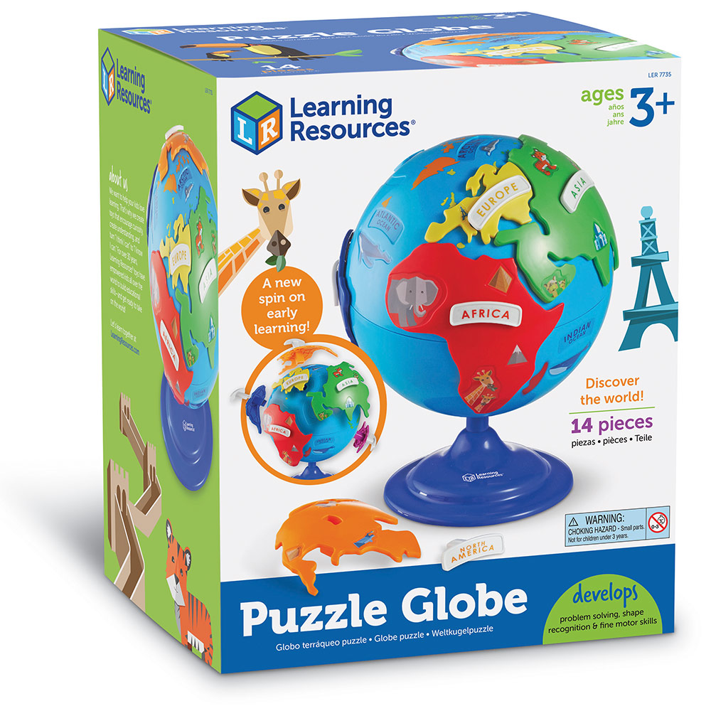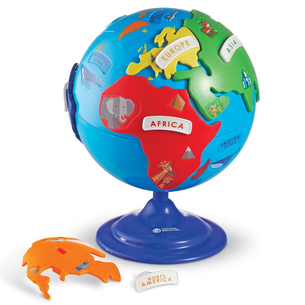 Globus slagalica donosi potpuno novi obrt u učenju geografije! Globus je dizajniran da pomogne učenicima da istraže kontinente, okeane, poznate znamenitosti, različite vrste životinja i još mnogo toga. Velikidopunski elementi su dizajnirani da odgovaraju rupama na globusu, tako da je deci olakšati da postqave kontinente na svoje mesto. Set uključuje čvrstuizdržljivu osnovu (sa obeleženim okeanima), rotirajući globus, 6 delova slagalice- kontinente, 6 plastičnih nalepnica za kontinente i prazne nalepnice za etikete.