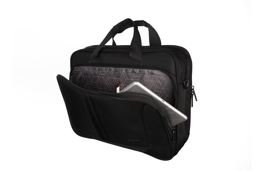 Izuzetno praktična i prostrana laptop torba sa dva glavna odeljka od kojih je jedan sa posebnim džepom za računar do 15,6″ (35,5x26x3cm) i velikim odeljkom za čuvanje dokumenata. Prednji džepa sa rajsferšlusom za odlaganje manjih dodataka. U veliki zadnji džep sa rajsferšlusom, možete smestiti sve potrebne sitnice.  Torbu možete nositi u ruci, preko ramena zahvaljujući podesivom kaišu ili je jednostavno možete pričvrstiti za kofer.