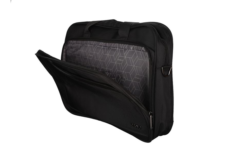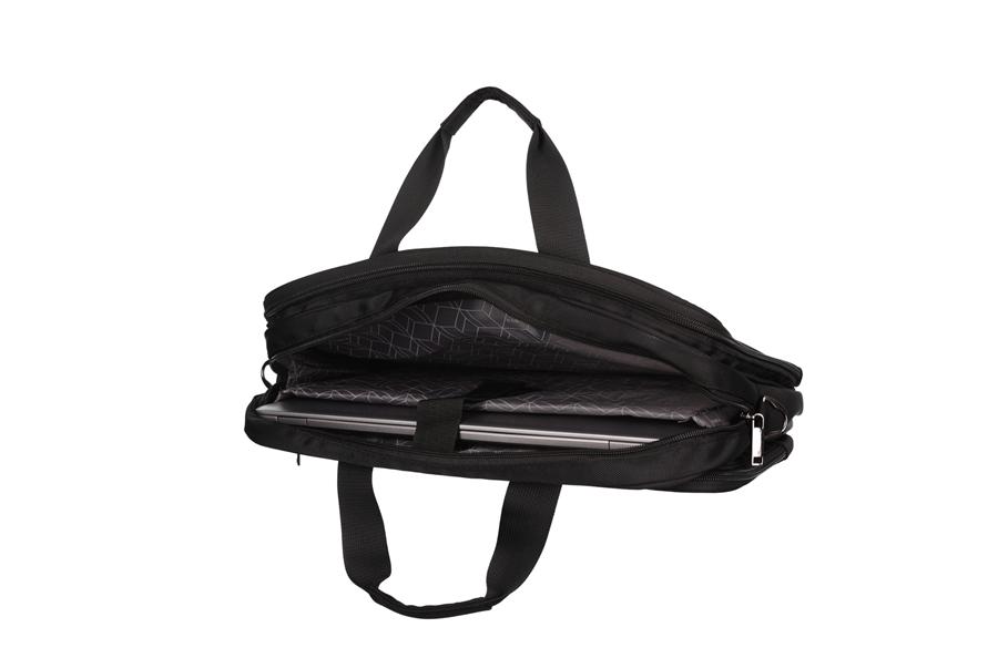 Izuzetno praktična i prostrana laptop torba sa dva glavna odeljka od kojih je jedan sa posebnim džepom za računar do 15,6″ (35,5x26x3cm) i velikim odeljkom za čuvanje dokumenata. Dva manja prednja džepa sa rajsferšlusom za odlaganje manjih dodataka, kao i jedan bez rajsferšlusa. U veliki zadnji džep sa rajsferšlusom, možete smestiti sve potrebne sitnice. Torbu možete nositi u ruci, preko ramena zahvaljujući podesivom kaišu ili je jednostavno možete pričvrstiti za kofer.