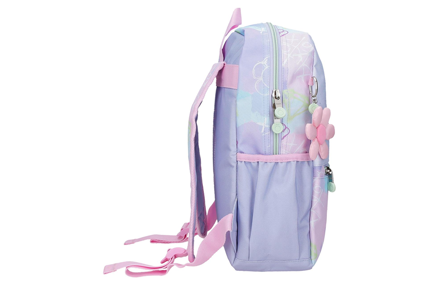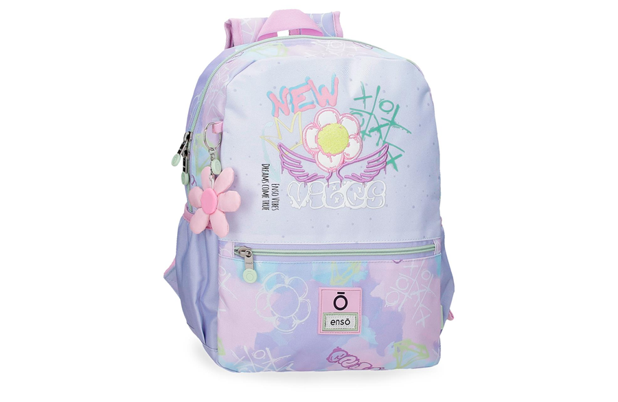 Ranac ima široke i podesive naramenice koje se savršeno prilagođavaju leđima, garantujući udobnost tokom celog dana. Na prednjoj strani nalazi se plišani privezak u obliku cveta, koji ovom modelu dodaje razigran i jedinstven izgled — pravi Enso potpis pun šarma.