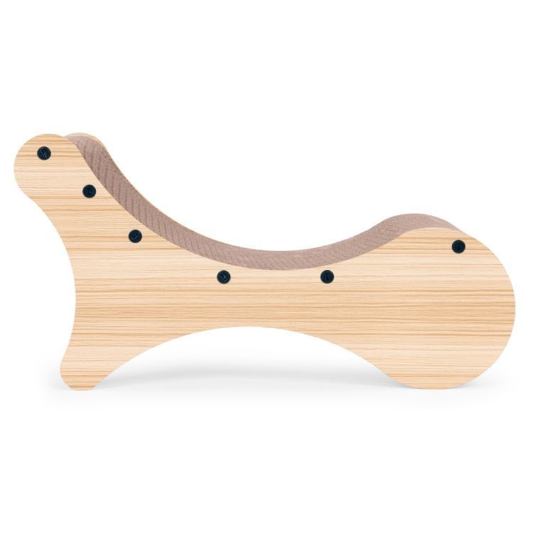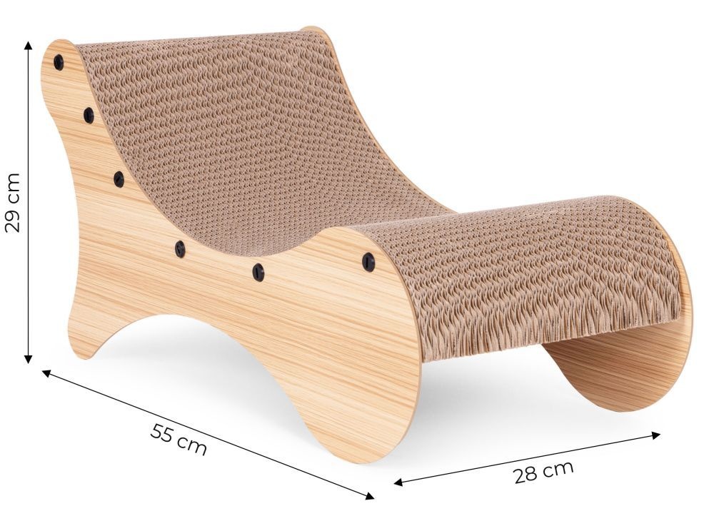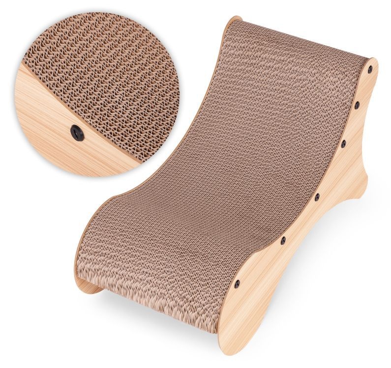 Grebalica/ ležaljka za mačke – Konstrukcija u obliku ergonomske ležaljke kombinuje funkciju grebalice i mesta za odmor, omogućavajući ljubimcu da na jednom mestu oštri kandže, isteže se i opušta. Površina od slojevitog kartona prirodno privlači mačke – pruža blagi otpor, zbog čega je grebanje prijatno i bezbedno. Čvrst ram od MDF ploče dodatno povećava stabilnost i izdržljivost, pa je grebalica pogodna i za intenzivnu svakodnevnu upotrebu. Zahvaljujući svom obliku, proizvod štiti nameštaj i druge površine u domu od oštećenja. PAKOVANJE Proizvod je pažljivo upakovan u zaštitnu foliju. Svi elementi su dodatno obezbeđeni kako bi se sprečila oštećenja tokom transporta. Dimenzije pakovanja: 57,5 x 11 x 27,5 cm Težina: 1,02 kg
