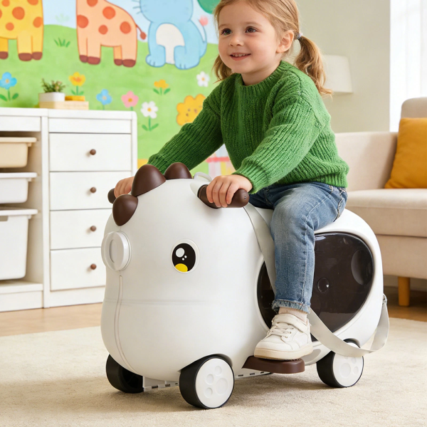 Ova vesela guralica u formi kofera osmišljena je za male istraživače koji vole da imaju „svoj prtljag“. Prostrana unutrašnjost pruža dovoljno mesta za stvari potrebne za put, dok stabilni točkovi i lagana konstrukcija omogućavaju laku, sigurnu i zabavnu vožnju.