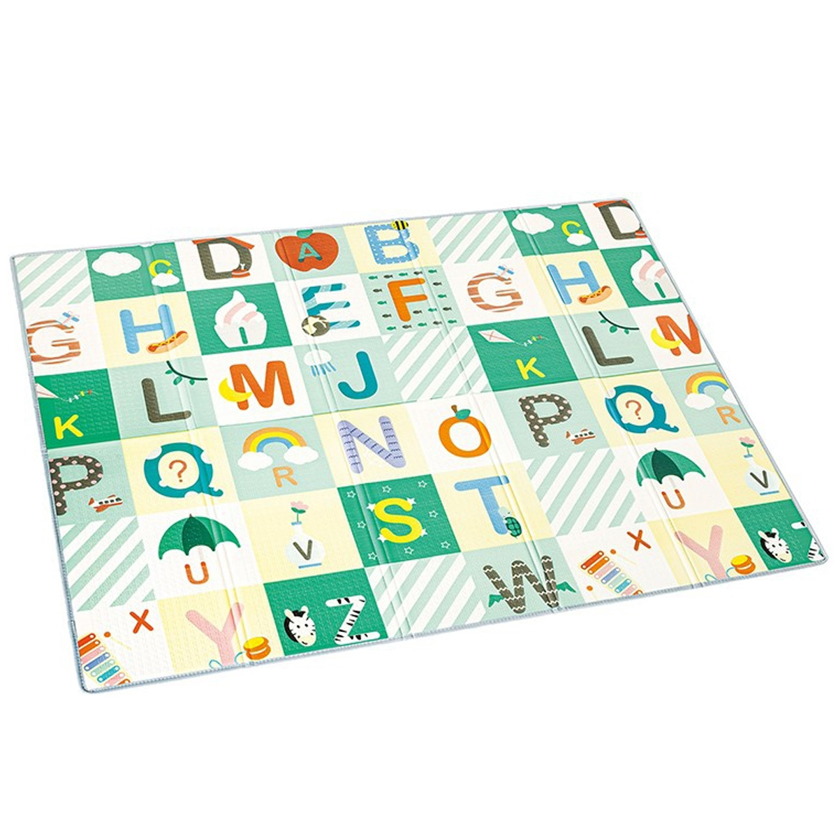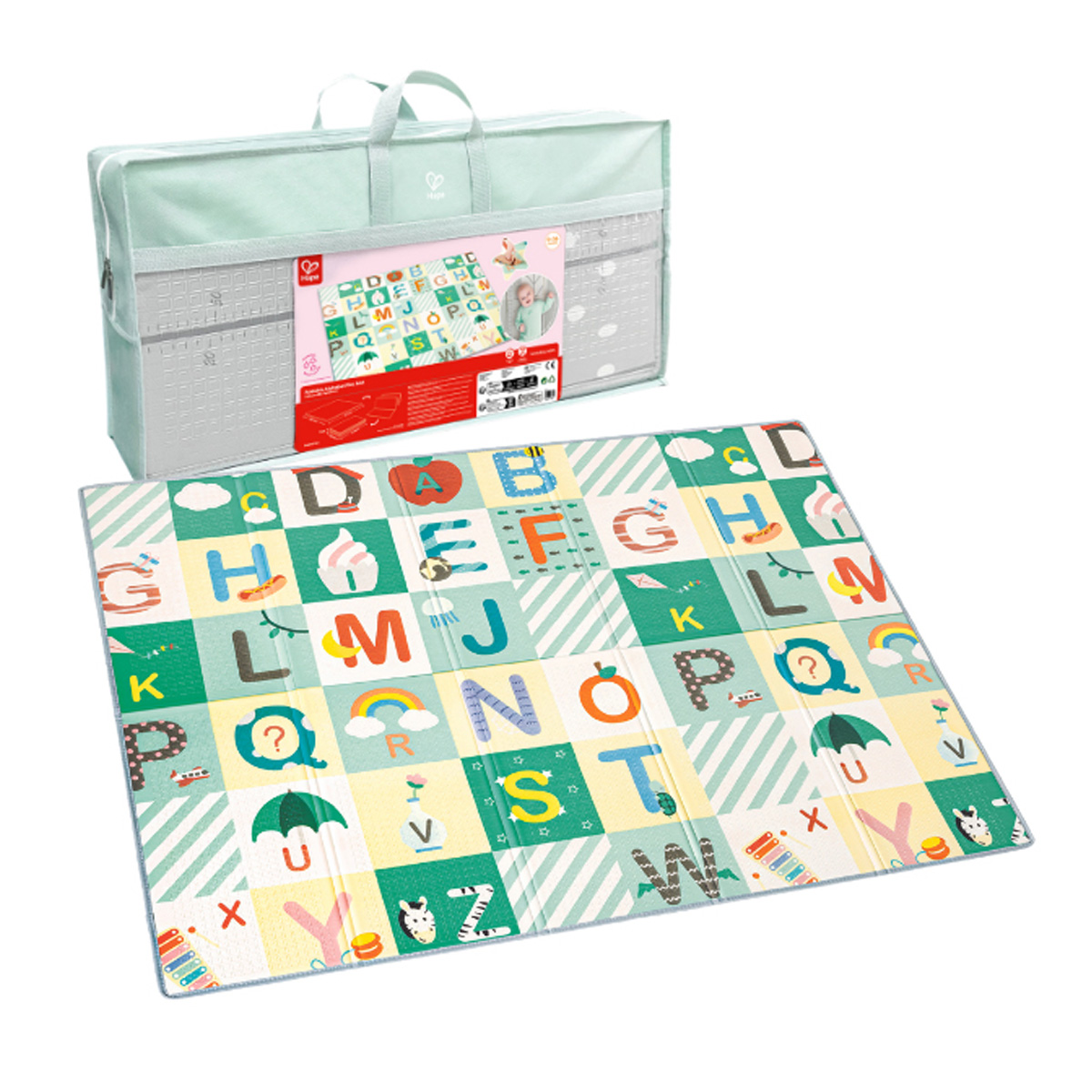 Savršeno mesto da se bebe aktiviraju i zabave uz učenje! S jedne strane podloge je abeceda koja omogućava učenje slova i čitanje, a druga strana ima mernu skalu tako da možete pratiti kako beba raste. Napravljena od bezbednog, mekog, otpornog materijala i mastila na bazi biljaka, ova velika prostirka za igru je takođe vodootporna, lako se briše i skladišti kada se igra završi.