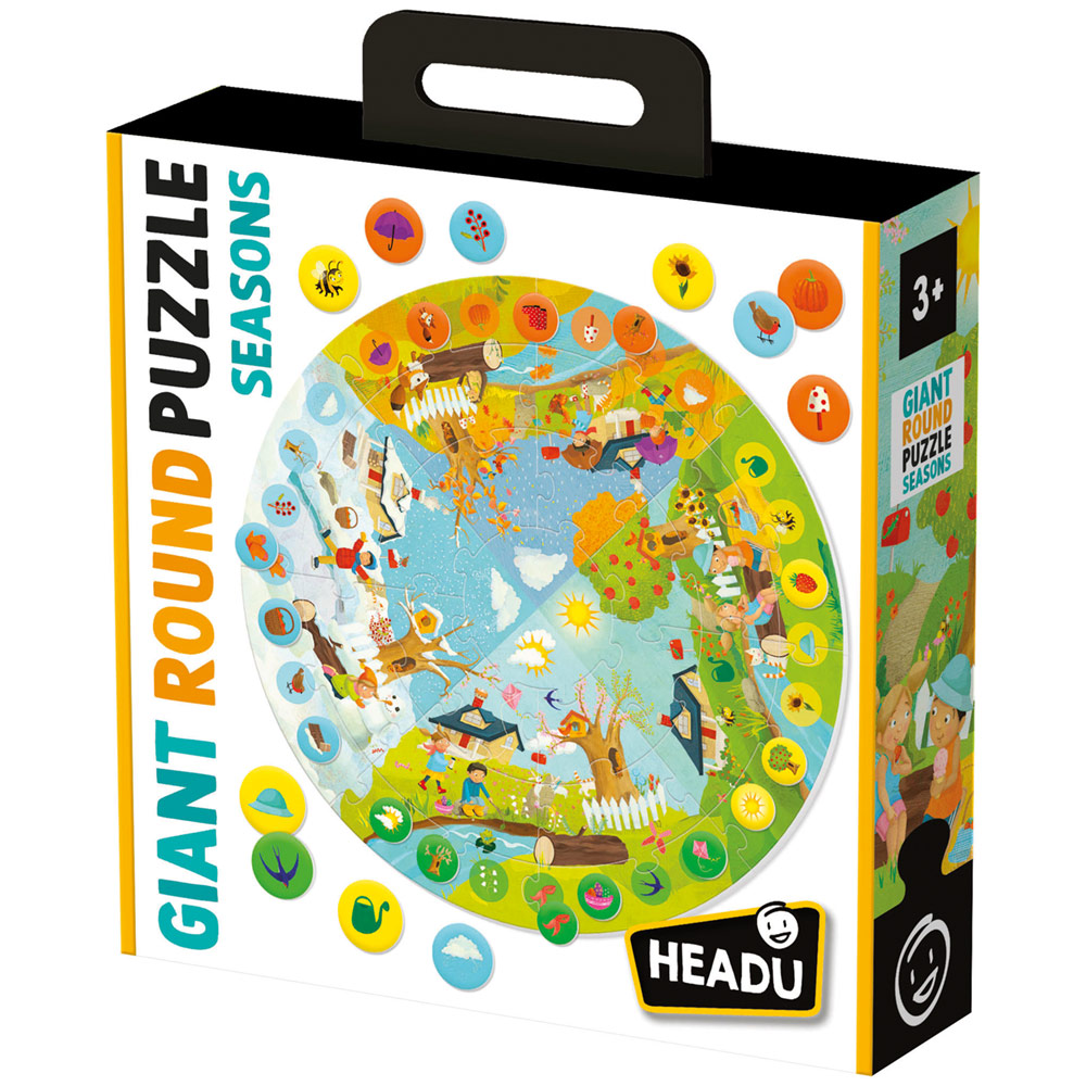 Velika kružna igra podstiče dečiju radoznalost, omogućavajući im da otkriju čuda prirode kroz četiri godišnja doba. Pored delova slagalice, set uključuje i tokene koji dodatno upotpunjuju celokupnu sliku. Manipulisanjem delovima puzle, deca razvijaju finu motoriku i koordinaciju ruka-oči.