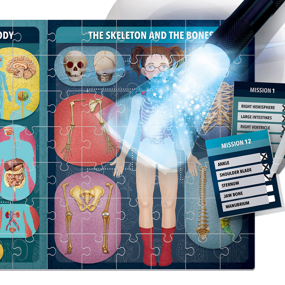 Spojte delove slagalice i saznajte od čega se sastoji ljudsko telo! Neka vaše dete otkrije fascinantne detalje o vitalnim organima, kostima i još mnogo čemu, a zatim uz pomoć lampice saznajte šta se još dodatno krije kako biste prešli misiju! Sjajan Headu set koji će detetu razviti čula, kreativnost i dodatno unaprediti znanje.