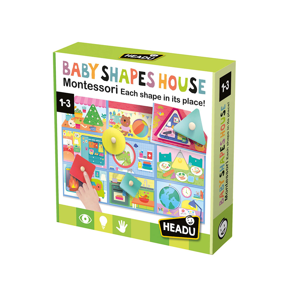 Kakav je oblik lampe? A šta je sa ogledalom? Zabavna igra, inspirisana Montesori pristupom, kroz koju deca grade kuću i uklapaju oblike na pravo mesto, pomoći će deci da razvijaju motoričke veštine i uoče odnos deo-celina. Set sadrži drvene umetaljke različitog oblika koje je potrebno postaviti na odgovarajuće mesto na tabli.