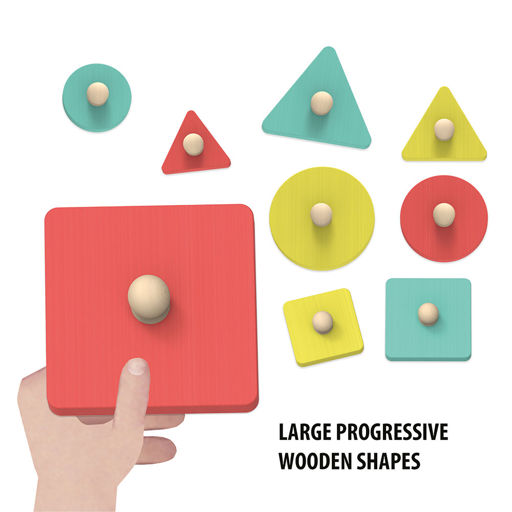 Set sadrži 9 tvrdih panela koji čine kuću i još 9 drvenih oblika koji se umeću (3 trougla, 3 kruga, 3 kvadrata – različite veličine).Uzrast: 1-3 godine. Napravljeno od kvalitetnih i sigurnih materijala i pogodno za mališane od godinu dana. Nema opasnosti od gutanja ili opasnih supstanci. Dimenzije sklopljene kuće – širine 44,50 cm x 29 cm, Uzrast: 1-3 godine, dimenzije pakovanja: 24.5 x 24.5 x 5.5 cm