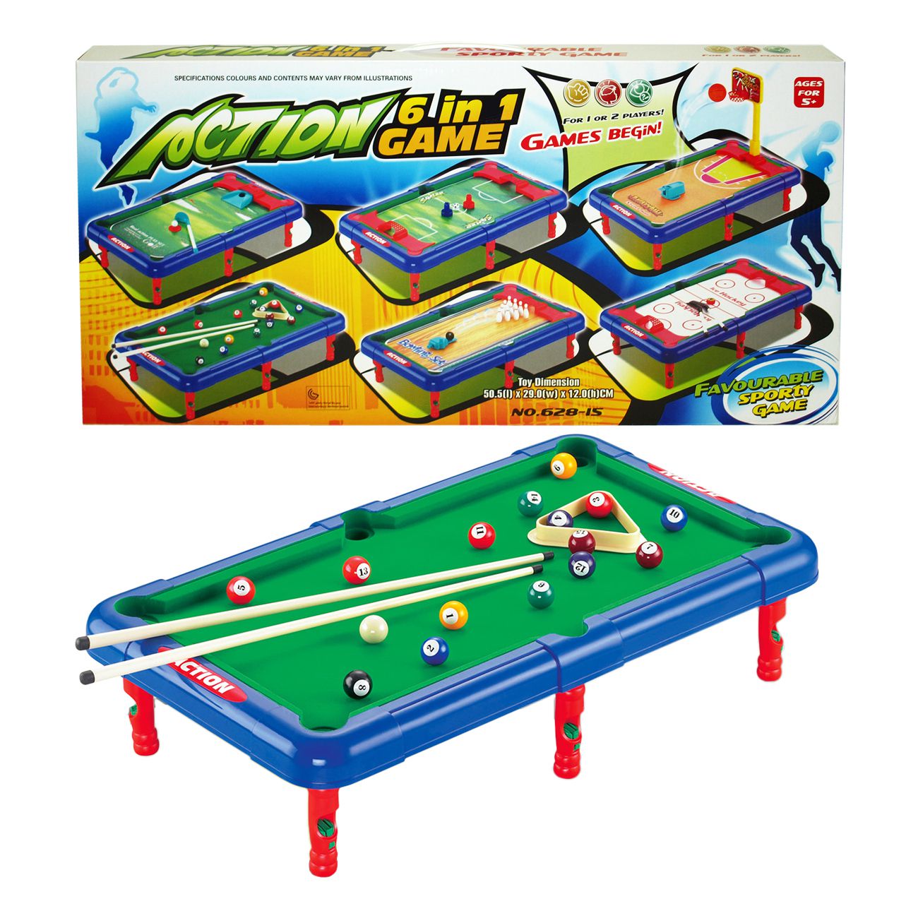 Komplet igara 6 u 1, ukupne dimenzije 12 x 50,5 x 29 cm. Stalak sa izmenljivim podlogama za igranje 6 različitih uzbudljivih igara: fudbal, košarka, hokej, kuglanje, bilijar i golf. Preporučena starost 5+.