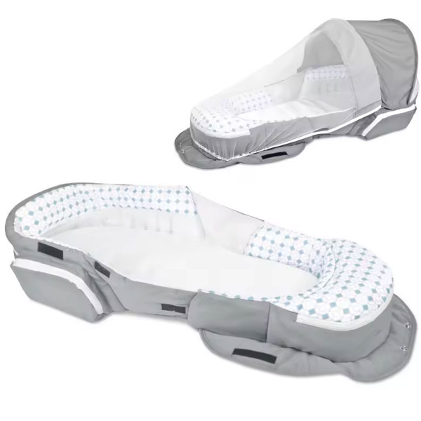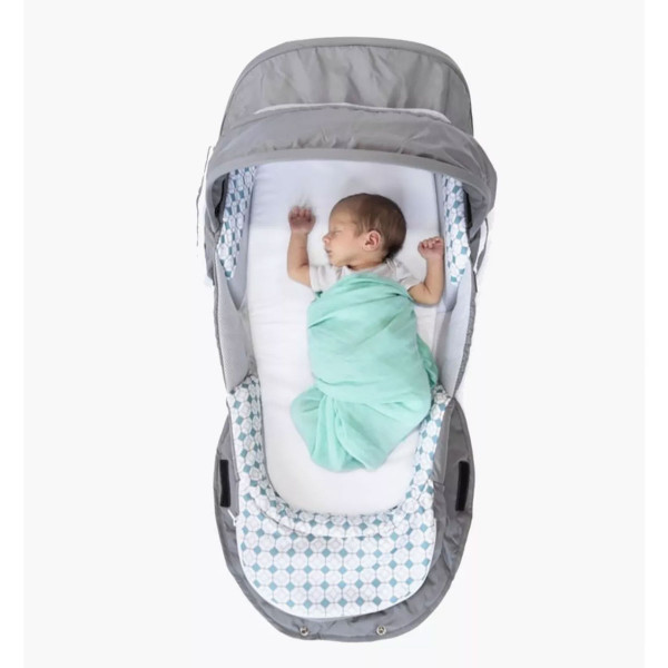 Višenamensko gnezdo za bebe koje se lako transformiše u ranac – idealno za roditelje u pokretu. Kada je rasklopljeno, služi kao prostirka za prepovijanje ili bezbedno gnezdo sa baldahinom.