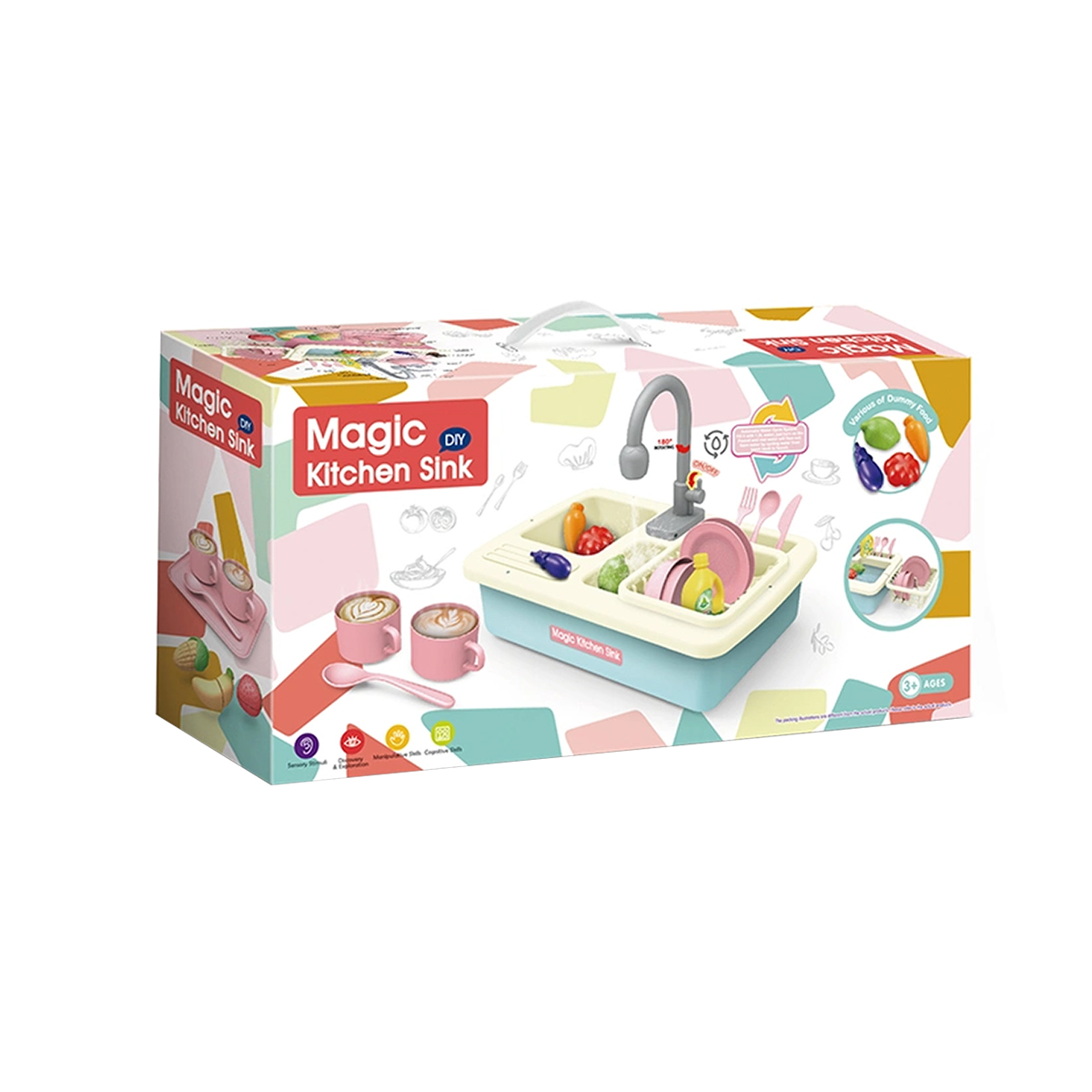 Ova plastična sudopera za decu pretvara igru svakodnevnih aktivnosti u zabavno i korisno iskustvo. Dizajnirana tako da omogućava protok vode, podstiče decu na imitaciju pranja sudova, razvijajući pritom motoriku i osećaj za odgovornost kroz igru. U setu se nalaze plastični sudovi, escajg i deterdžent, ali i plastične namirnice. Idealna je za maštovitu igru koja povezuje učenje i zabavu u jednom.