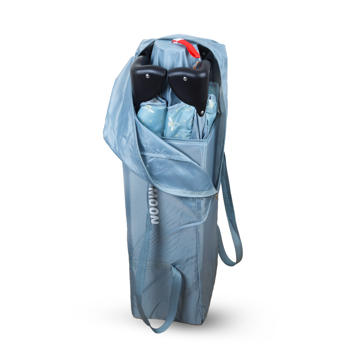 -Moon krevetac ima mehanizam koji omogućava lako rasklapanje i sklapanje na male dimenzije tako da može stati u torbu koja se dobija uz njega i skladištiti ili poneti na kraća ili duža putovanja.
