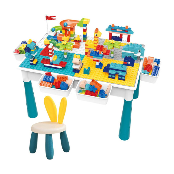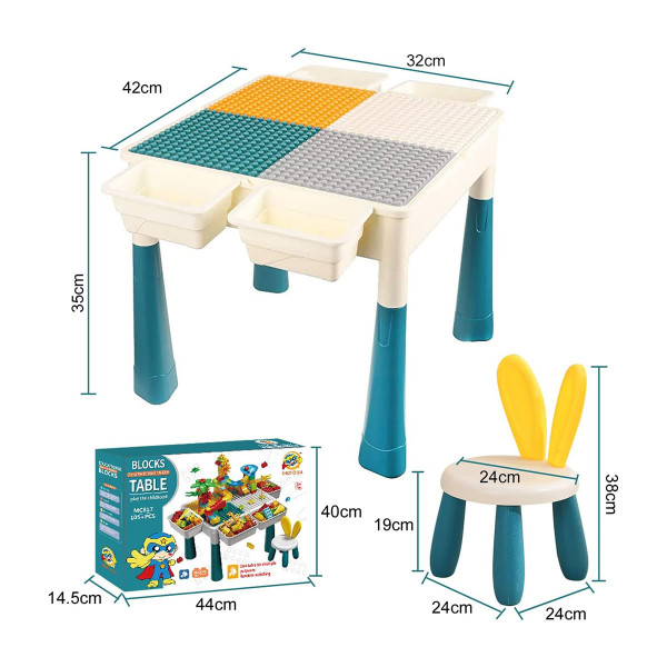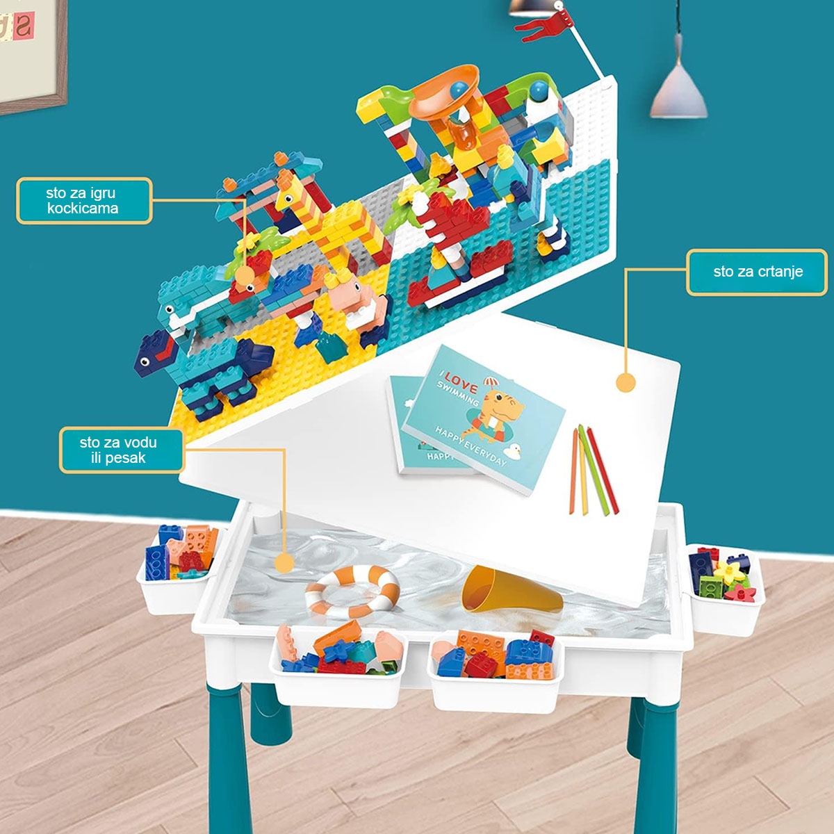 Ovaj set sadrži stočić i stolicu uz koji dolaze kocke različitih boja i veličina. Deca mogu da slažu i kombinuju delove kako bi pravila razne oblike, tobogane, životinje i druge maštovite kreacije. Idealno za podsticanje kreativnosti, prostorne percepcije i koordinacije pokreta kroz igru.