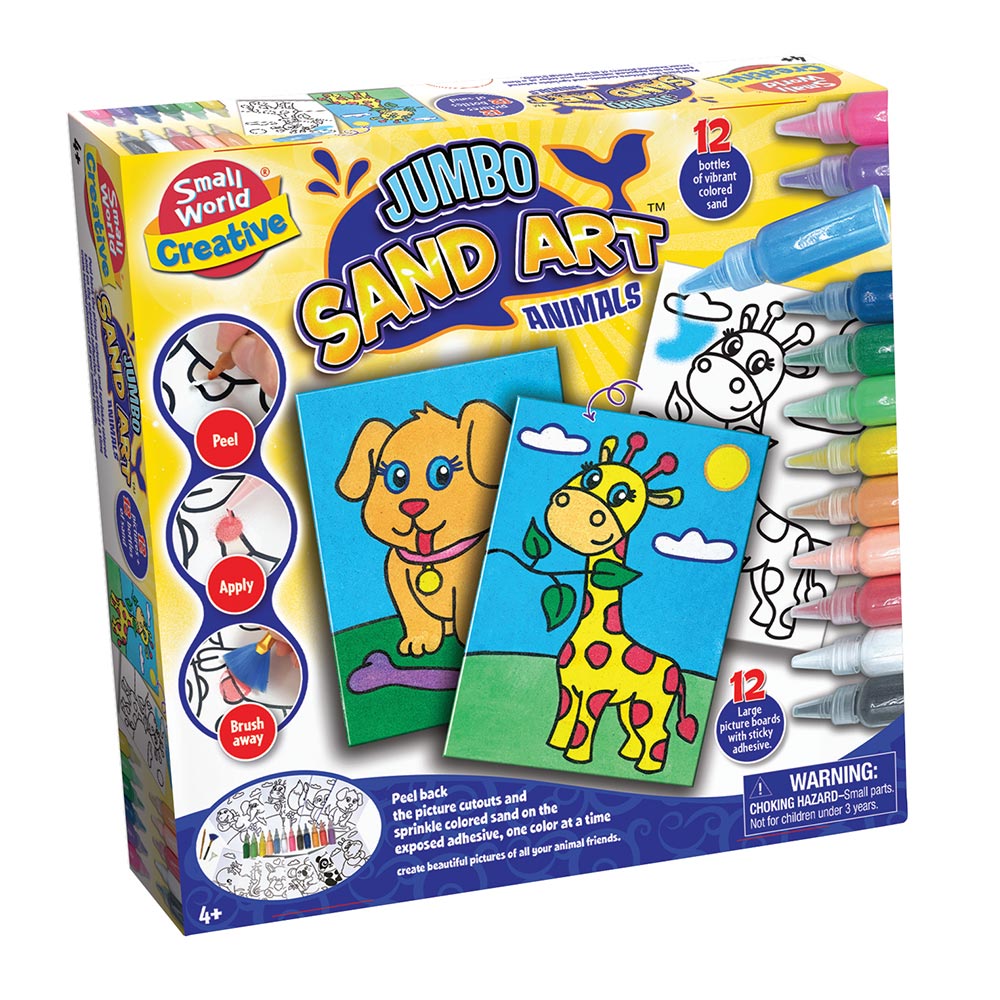 Sadrži: 12 slika životinja sa lepljivim premazom, 12 tuba peska u boji, 1 četku, 1 plastični štapić, 1 levak i uputstvo. Uzrast: 4+