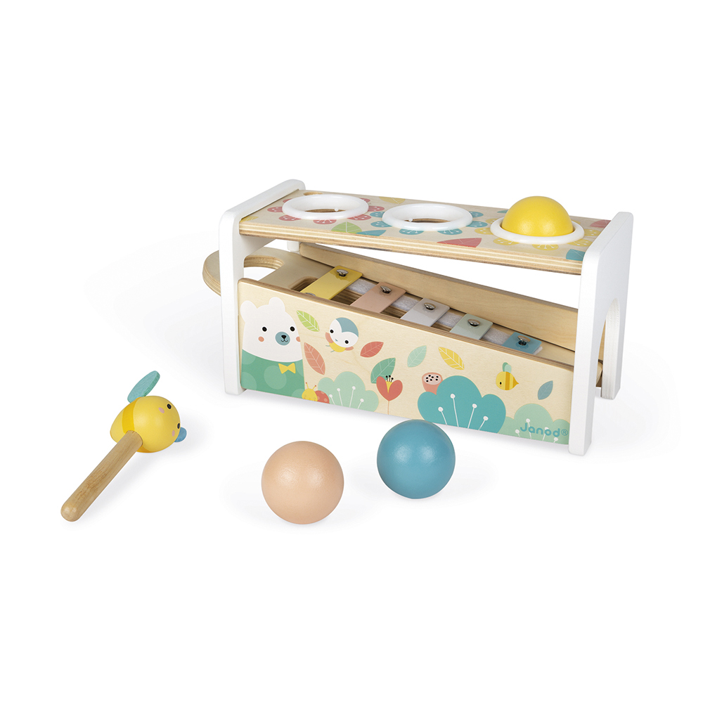 Proleće je u bebinoj sobi! Cveće i slatke životinje pojavile su se u ovoj prelepoj drvenoj igri veštine. Ona će omogućiti vašem mališanu od 18 meseci da razvija svoju spretnost dok se zabavlja. Pjur Tap Tap ksilo je igra 2 u 1: čekić za pčele koji udara 3 loptice koje padaju dok zvecka dirkama ksilofona, koji se takođe može ukloniti kako bi se mogao igrati svuda! Deca će moći da uče o bojama postavljajući svaku lopticu na odgovarajuću rupu za boju. Probudiće svoja čula, maštati i stvarati svoje prve priče.