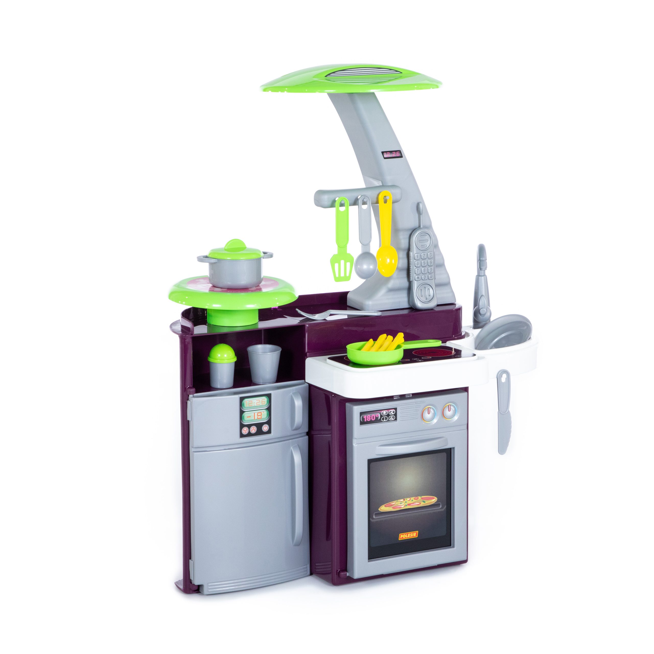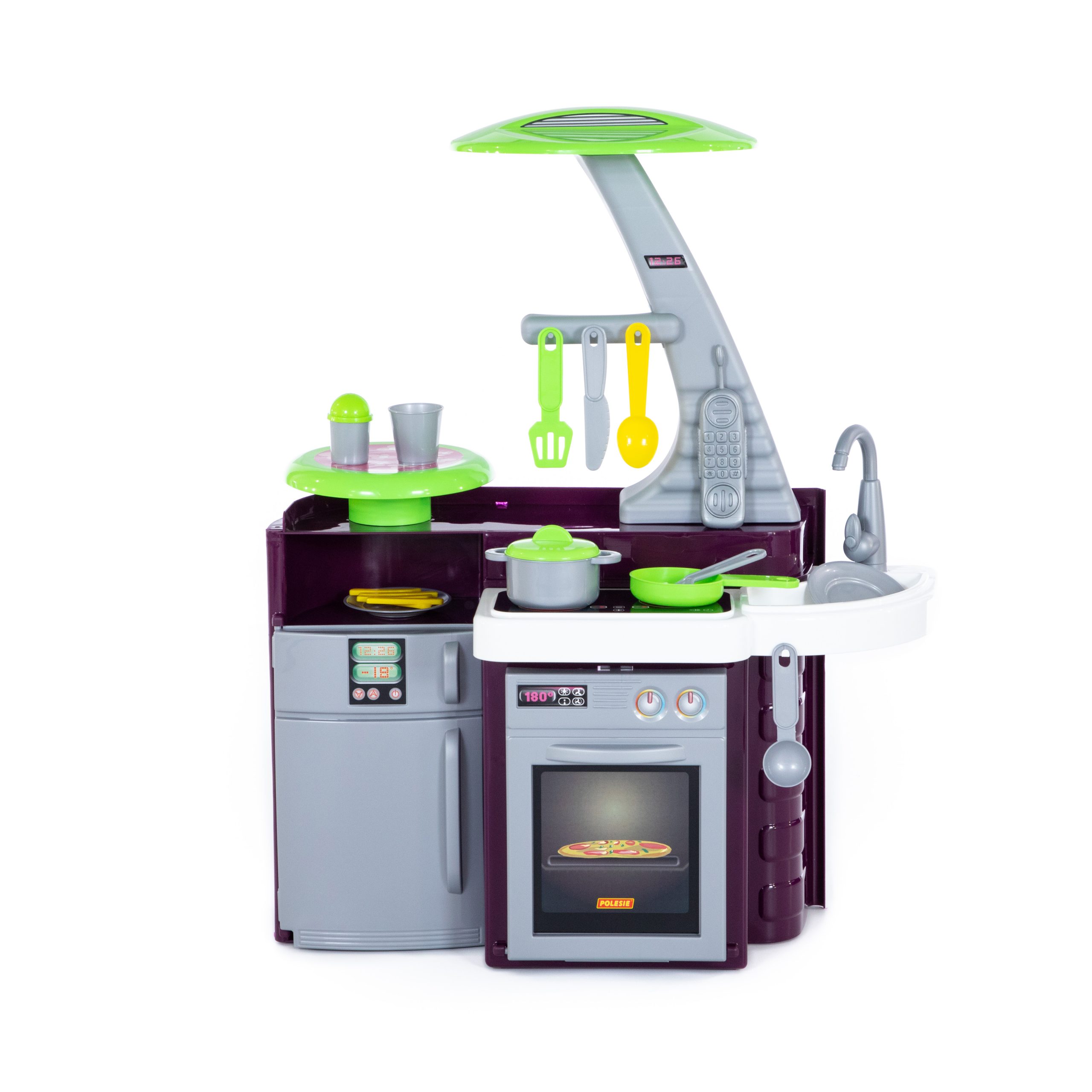 Kuhinja se izdvaja po modernom dizajnu, funkcionalnosti i opremljenosti. Garnitura je opremljena šporetom, sudoperom, napom, frižiderom, pećnicom, nekoliko polica za posuđe i kukama za pribor za jelo. U kompletu su i: – šerpa – 1 kom – tiganj – 1 kom – čaša – 1 kom – tanjiri – 2 kom – nož – 1 kom – kašika – 1 kom – viljuška – 1 kom – igračka dečiji radiotelefon – 1 kom – francuski pomfrit – 1 kom Dimenzije 415х280х540 sklopljeno 610х340х750mm