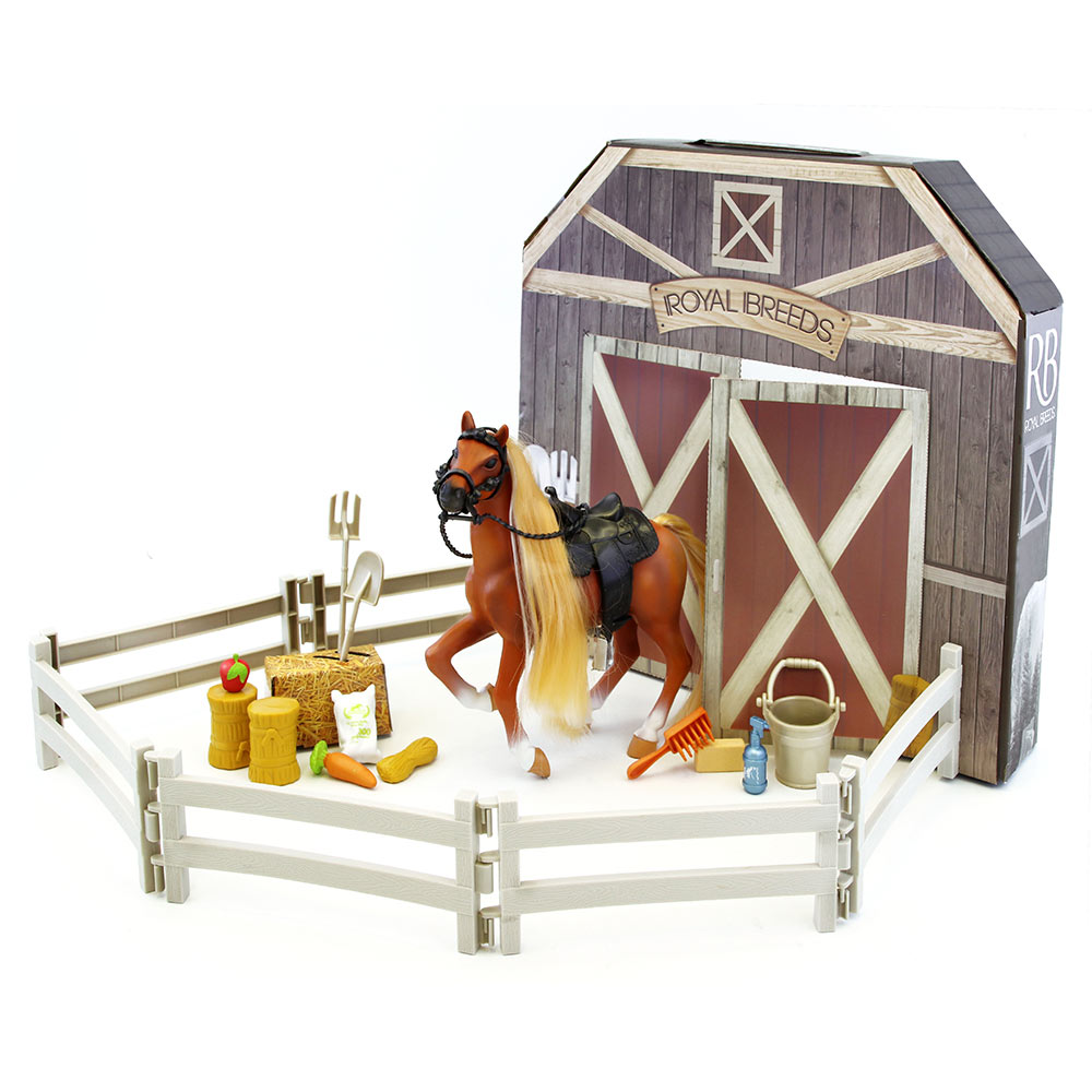 Set za igru koji simulira štalu za konje, sadrži plastičnu figuru konja u sivo-beloj boji, kantice i lopate za održavanje štale, opremu za hranjenje, jabuku, šargarepu, seno, kao i elemente za negu. Stimuliše igru mašte i uloga. Uzrast: 3+ Okvirne dimenzije pakovanja: 33 x 31 x 6