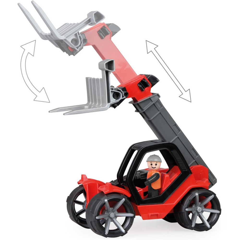 Teleskopski utovarivač LENA TRUXX sa gumom na točkovima, osovinama od pocinkovanog čelika 4 mm, kabinom vozača , 2-stepenom podiznom rukom koja se može produžiti do 34 cm, viljuškom koja se može zakačiti na ručku, kukom za prikolicu i LENA® igračkom. Dužina: 35 cm. Pogodno za unutrašnju i spoljašnju upotrebu. Pogodno za decu od 2 godine.