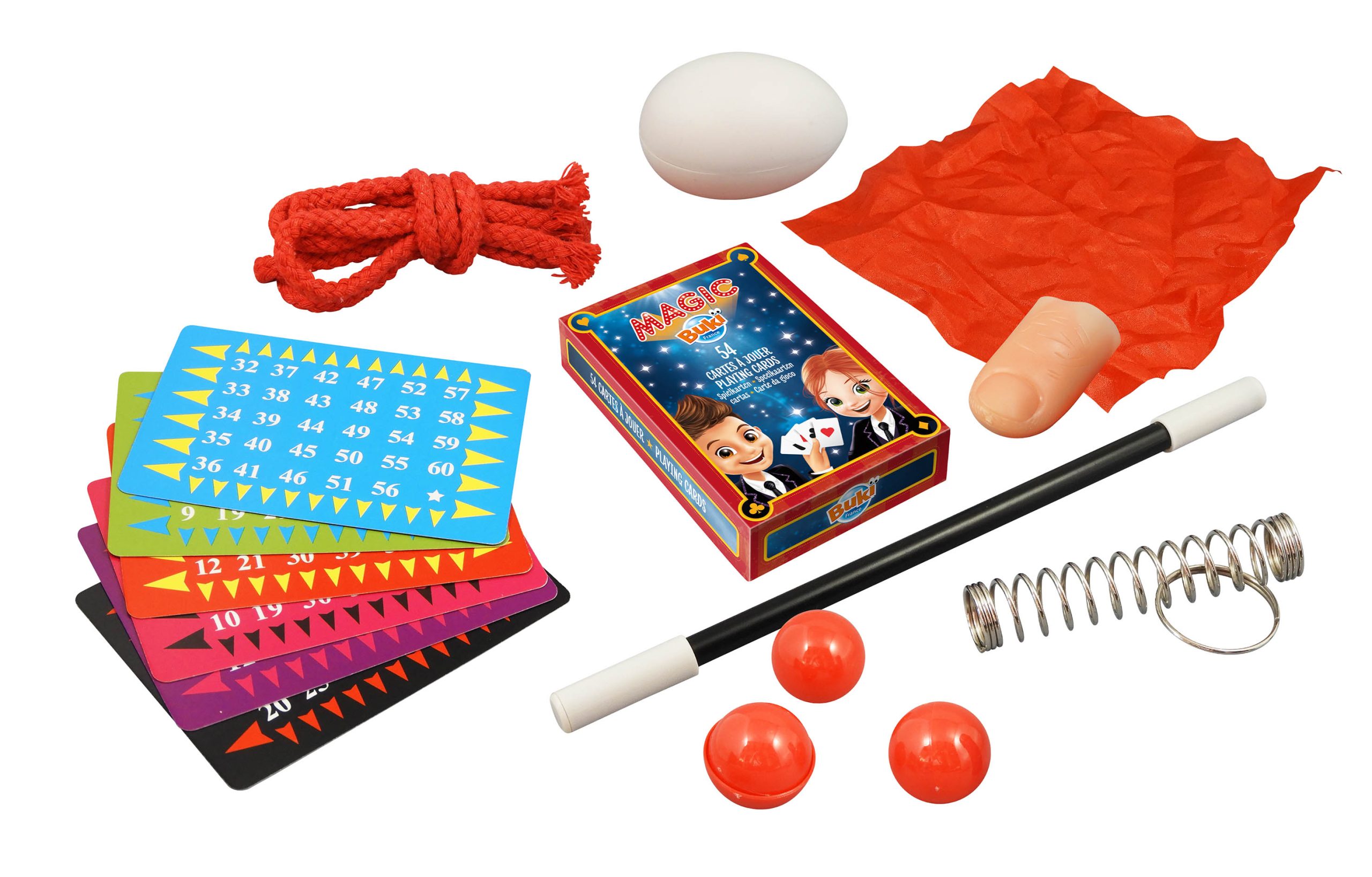 Komplet sadrži kvalitetne mađioničarske alate kao što su čarobni štapić, špil karata, specijalni „nestajući palac“, magični prstenovi i kanapi.