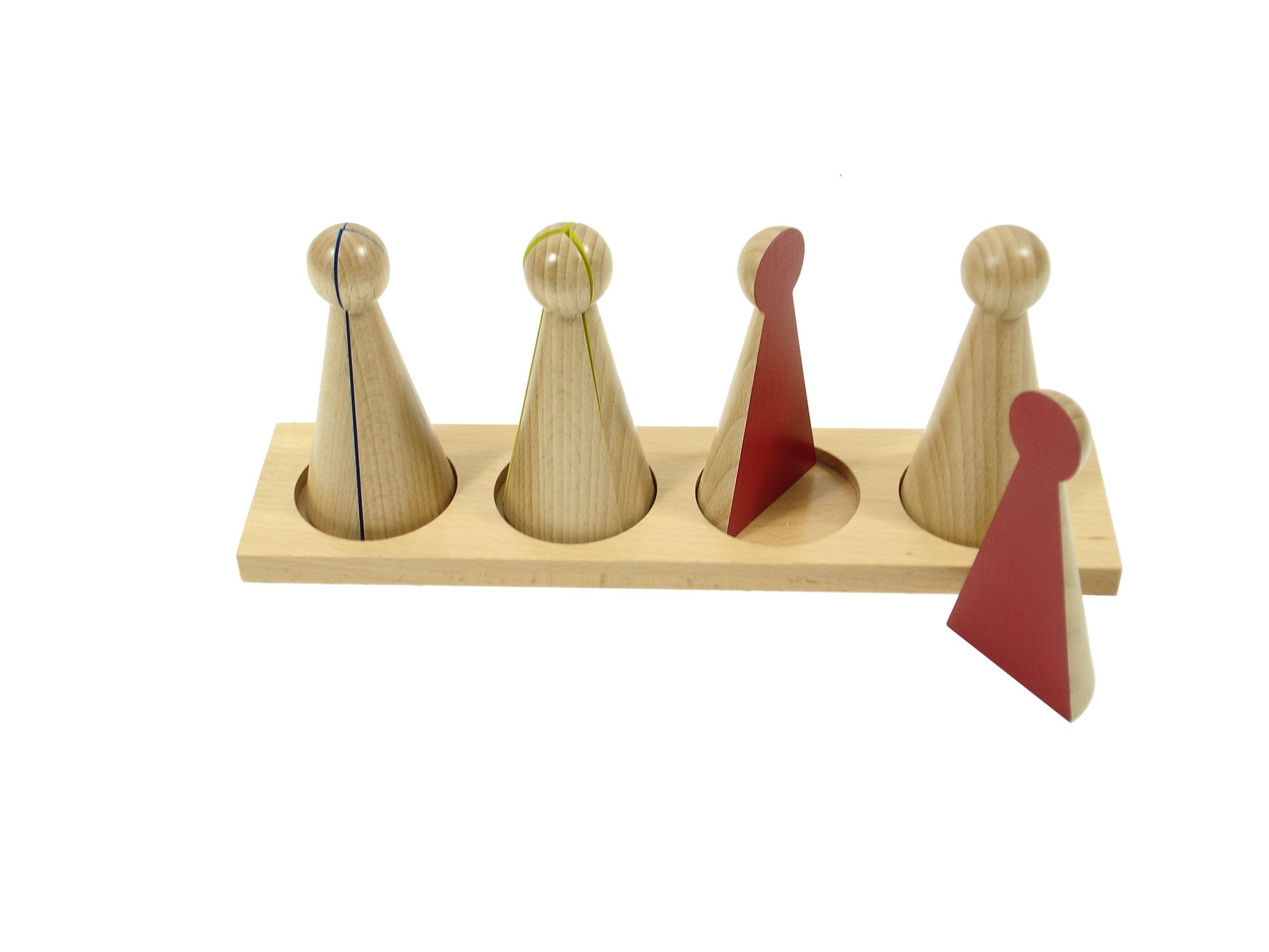 Montesori drveni čunjevi koji su podeljeni na polovinu, trećinu i četvrtinu.