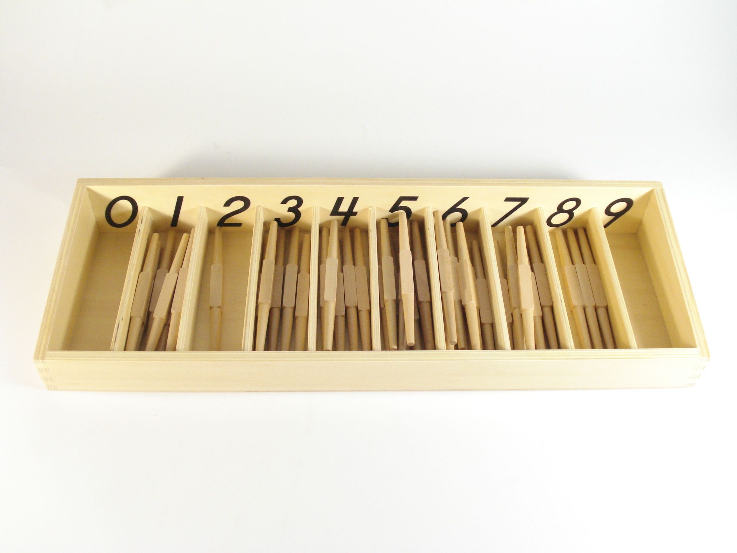 Drvena kutija sa 10 pregrada i 45 drvenih vretenastih štapića koji deci omogućuju vežbanje povezivanja količine i simbola brojeva od 0 do 9 koje ta količina predstavlja. Rad sa ovim štapićima doprinosi usvajanju pojma o količini i činjenici da količine nastaju od brojnosti elemenata, upoznaju dete sa pojmom nule i pojmom skupa. Uzrast: 3+