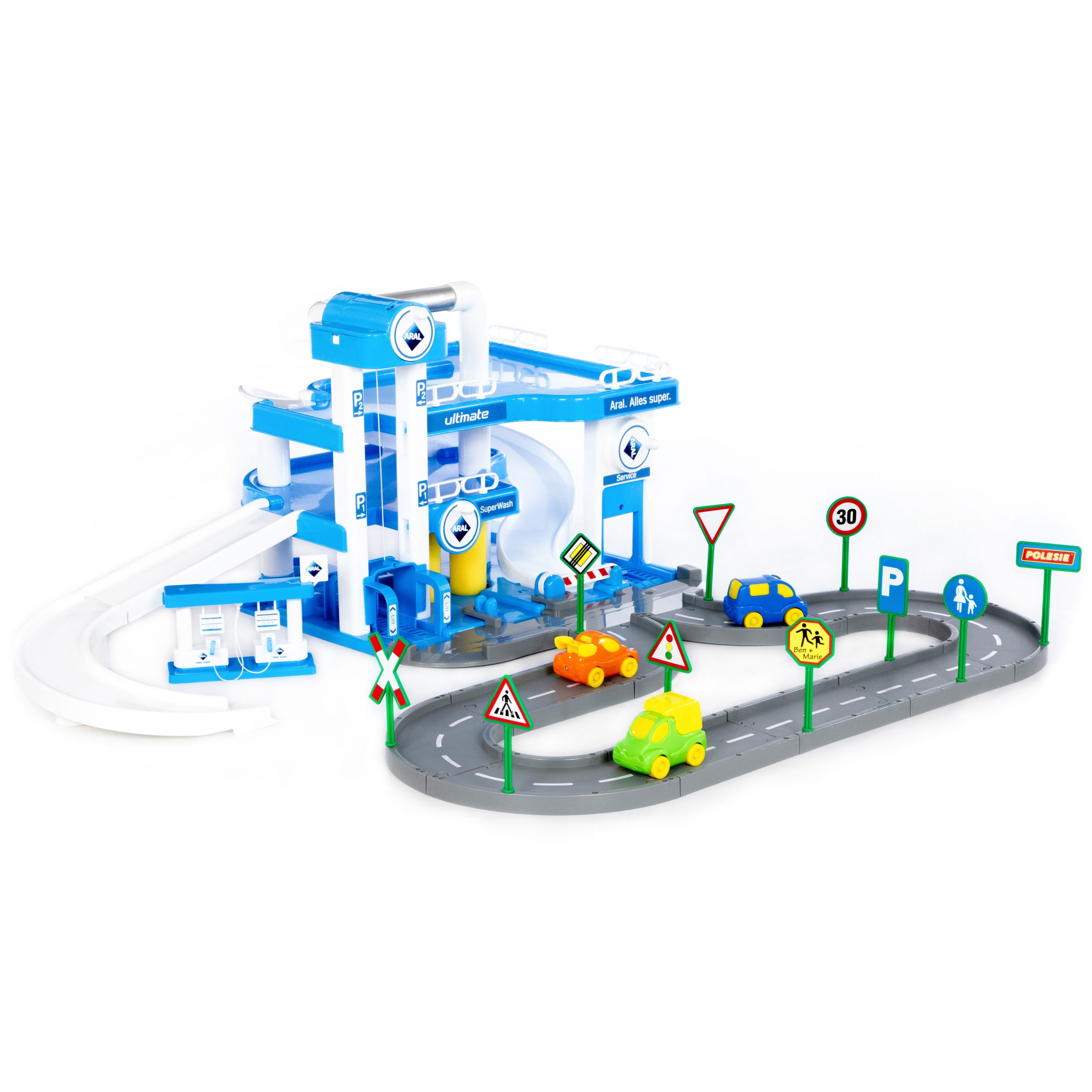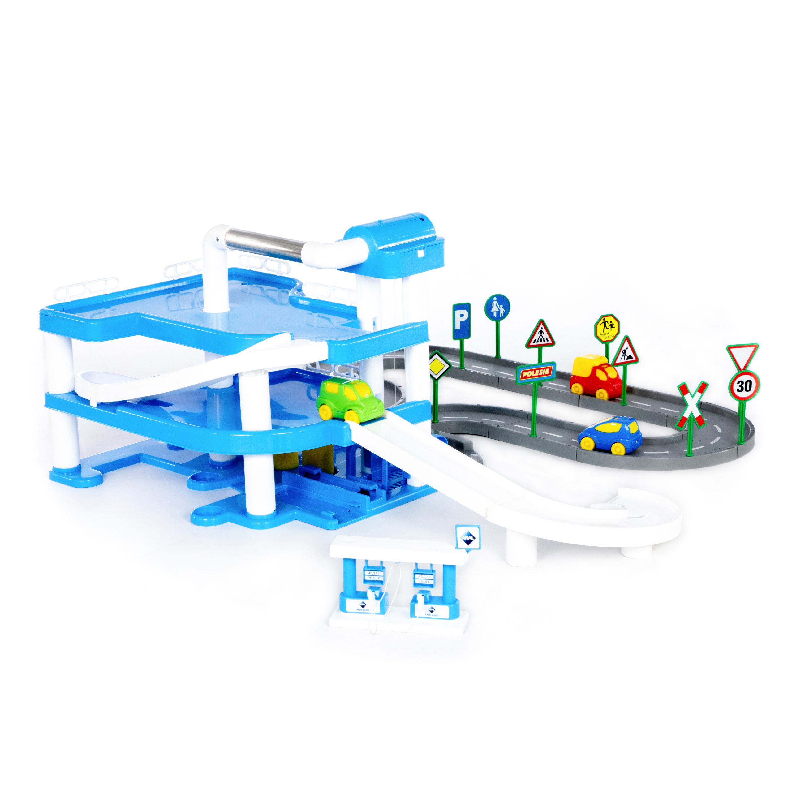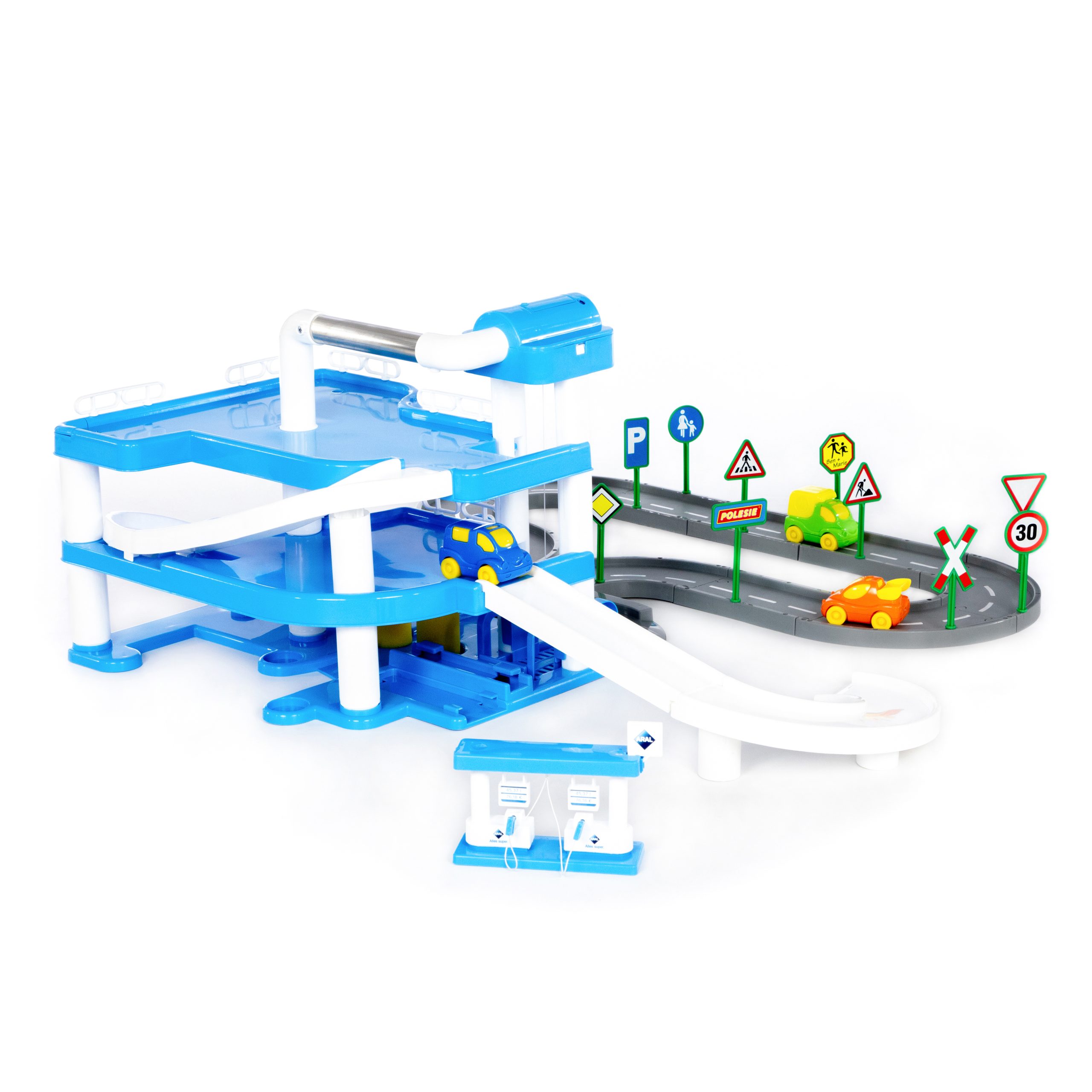 Parking 3 nivoa sa putem (u kutiji) je izraz Polesi umetnosti. Garaža sa putem (u kutiji). Garaža je parking na tri nivoa za automobile uključene u set (3 kom.). Na prvom nivou parkinga nalazi se benzinska pumpa, automehaničarska radionica (lift), autopraonica. Automobili mogu doći do drugog i trećeg nivoa liftom i spustiti se niz rampe. Svi ovi elementi za igru pokreću ručni pogon, to jest, da bi se igralo, dete treba da okrene ručku u blizini pokretnog elementa. Elementi puta sa putokazima (10 kom) savršeno nadopunjuju kompleks i čine igru sa njima još zanimljivijom. Parking (bez puta) u sklopljenom obliku je pogodan za kretanje iz jedne prostorije u drugu. Za to je obezbeđena metalna ručka. Dimenzije 485х390х390mm sklopljeno 1000х900х380mm