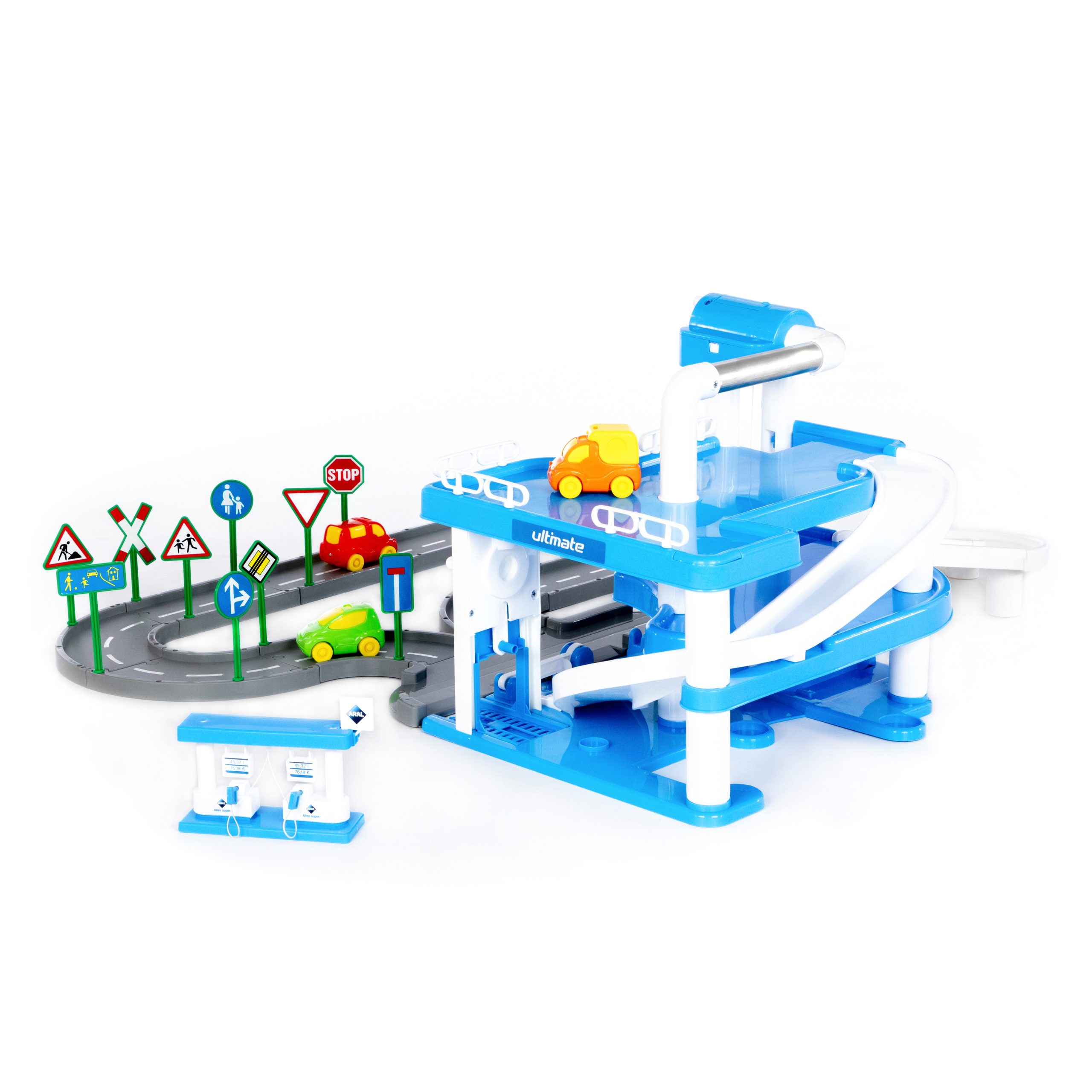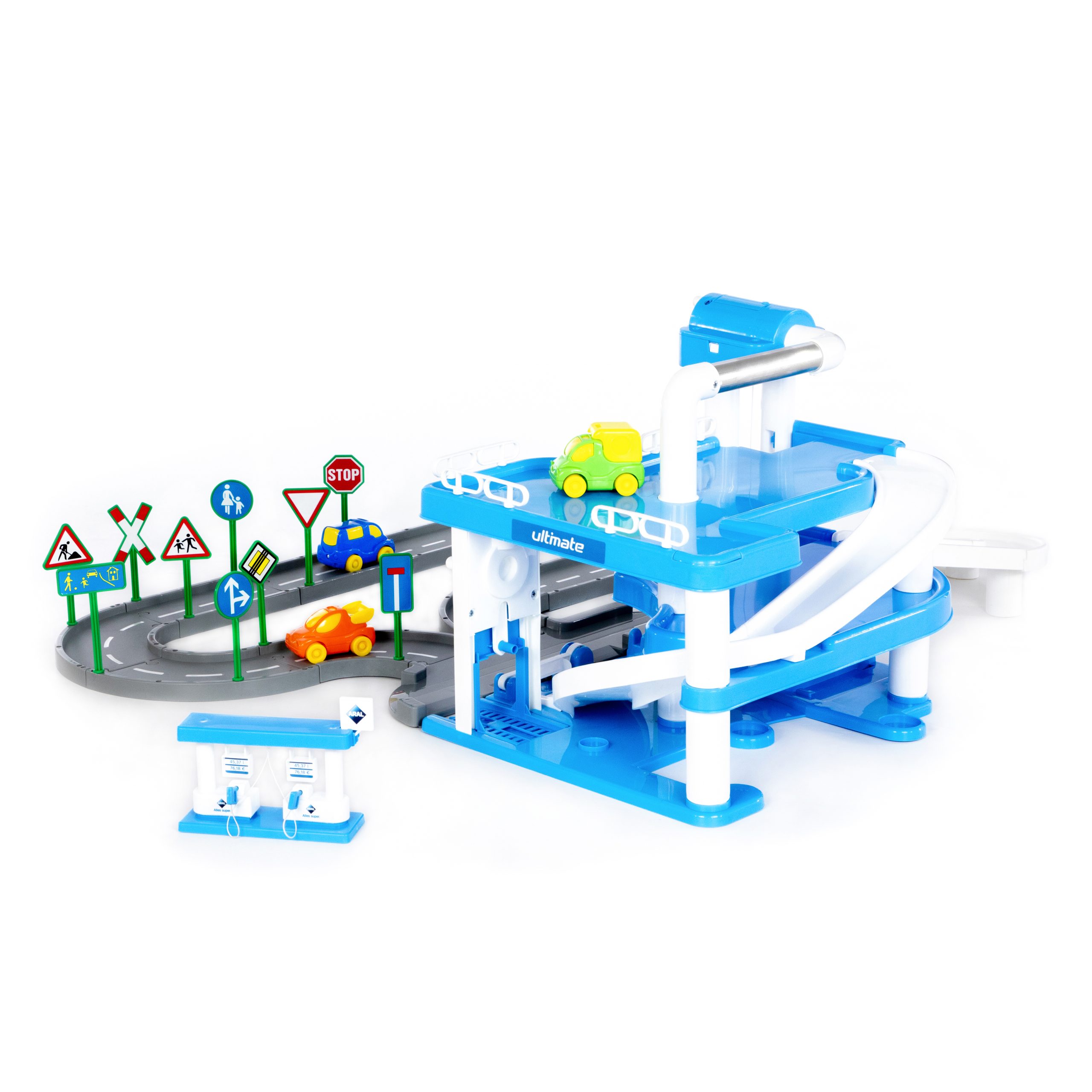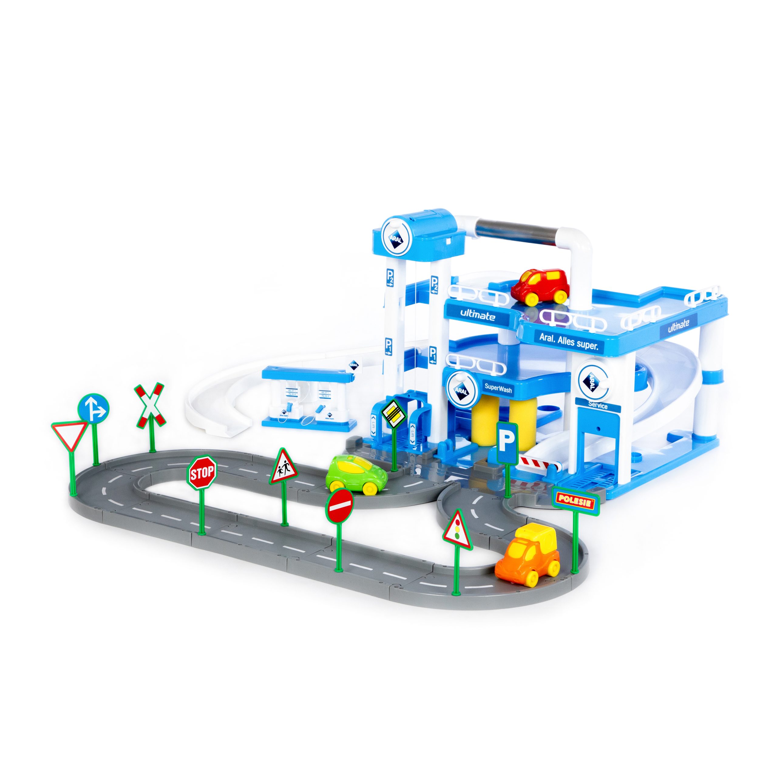 Parking 3 nivoa sa putem (u kutiji) je izraz Polesi umetnosti. Garaža sa putem (u kutiji). Garaža je parking na tri nivoa za automobile uključene u set (3 kom.). Na prvom nivou parkinga nalazi se benzinska pumpa, automehaničarska radionica (lift), autopraonica. Automobili mogu doći do drugog i trećeg nivoa liftom i spustiti se niz rampe. Svi ovi elementi za igru pokreću ručni pogon, to jest, da bi se igralo, dete treba da okrene ručku u blizini pokretnog elementa. Elementi puta sa putokazima (10 kom) savršeno nadopunjuju kompleks i čine igru sa njima još zanimljivijom. Parking (bez puta) u sklopljenom obliku je pogodan za kretanje iz jedne prostorije u drugu. Za to je obezbeđena metalna ručka. Dimenzije 485х390х390mm sklopljeno 1000х900х380mm