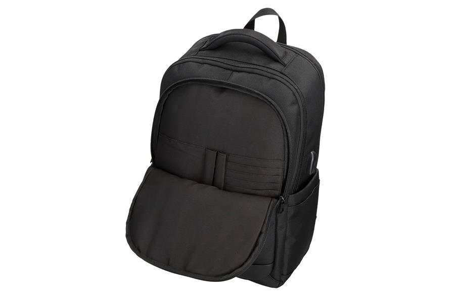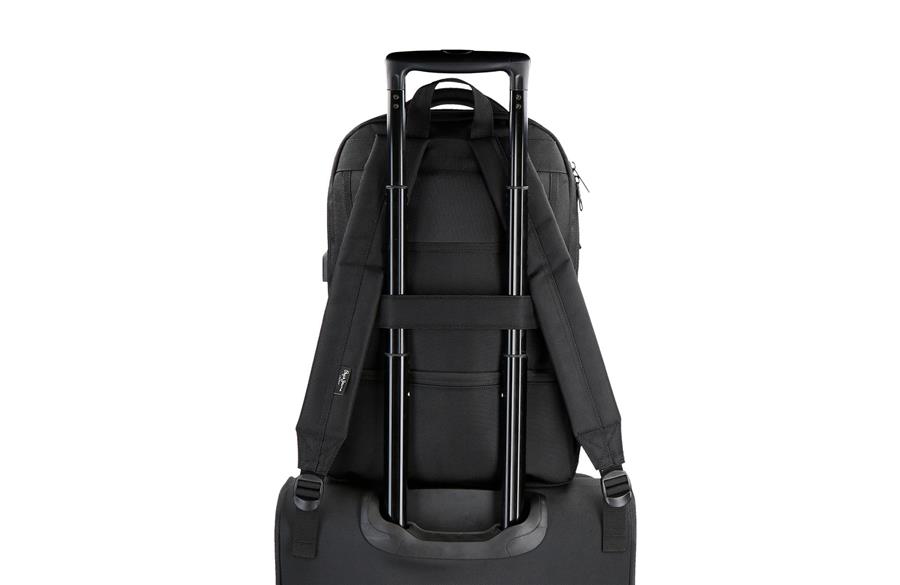 Ranac poseduje glavni odeljak sa specifičnim prostorom za laptop do 15,6 inča i džep za tablet. Opremljen je spoljnim integrisanim USB portom koji omogućava praktično punjenje vaših uređaja. Odeljak ima dva džepa, jedan sa rajsferšlusom i drugi manji idealan za mobilni telefon ili neki manji dodatak. Prednji džep sadrži pregrade za čuvanje dve olovke, mobilnog telefona i šest kartica. Bočni džepovi pružaju dodatni prostor za čuvanje dodataka. Široke, ergonomske i postavljene naramenice savršeno se prilagođavaju leđima, dok zadnja traka omogućava pričvršćivanje na kofer prilikom putovanja.