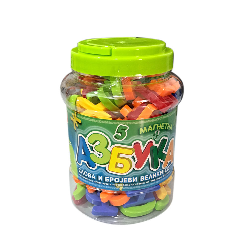 Magnetna azbuka set u teglici pogodna je za učenje slova, brojeva, formiranje prvih reči i učenje osnovnih matematičkih operacija. Set sadrži: 60 slova, 40 brojeva i 12 matematičkih simbola. Visina simbola: 35mm, prečnik teglice: 11.5cm, visina:17.5cm, Uzrast: 3+