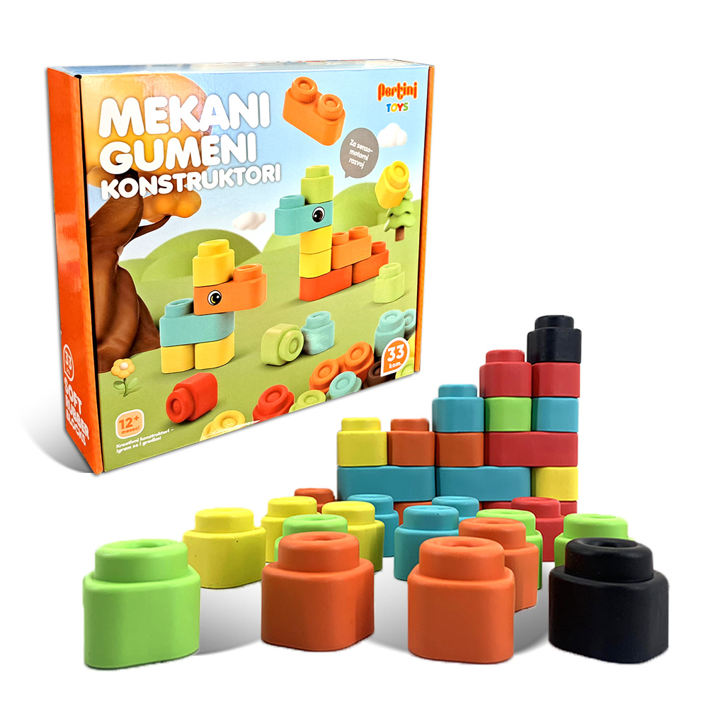 Pertini set od 33 mekana gumena konstruktora sadrži dve vrste konstruktora različitih oblika i veličine. Sigurni za upotrebu, lako se čiste i mogu se prati na max temperaturi od 30 stepeni.
